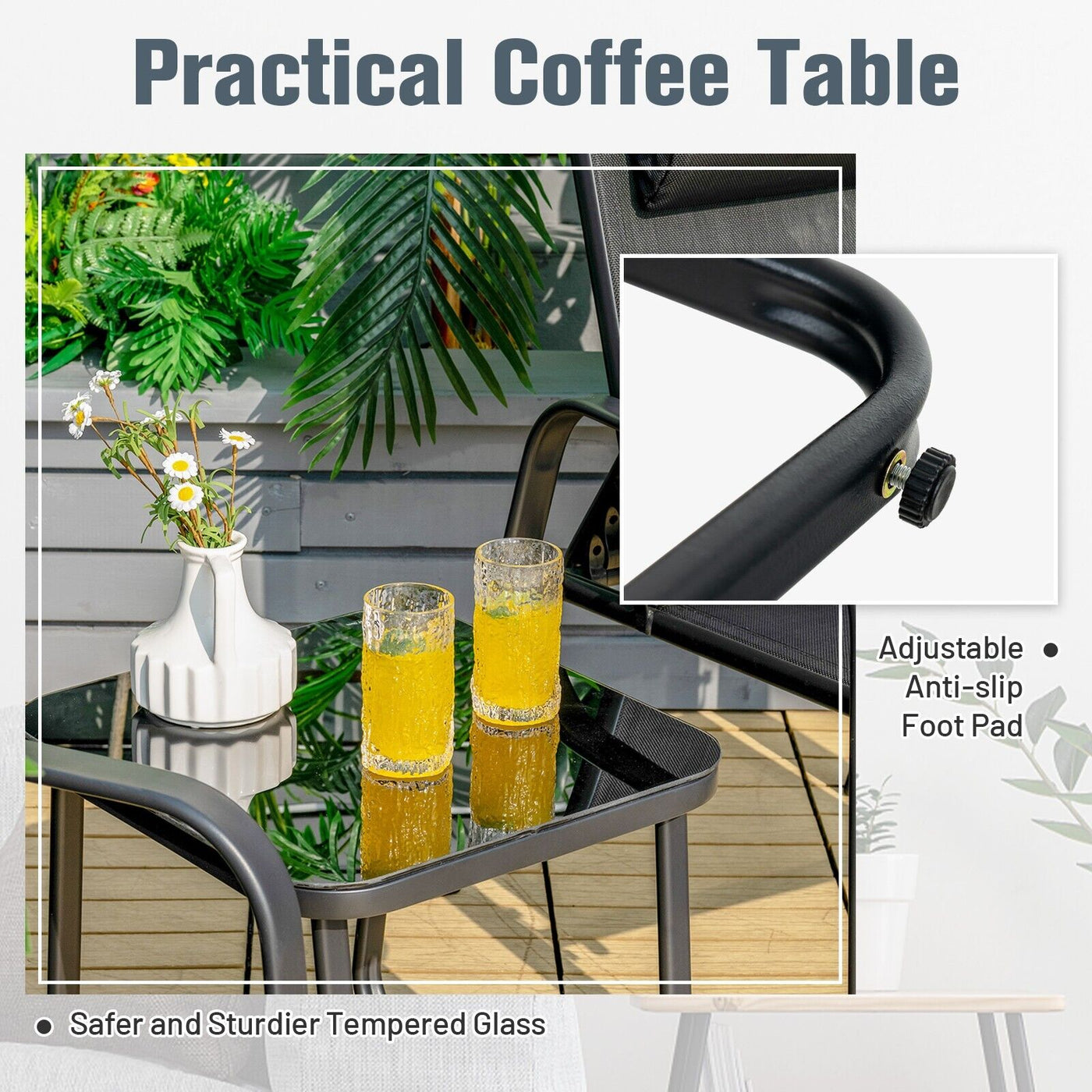 Designed with modern style and compact size, this outdoor conversation set not only brings out the perfect taste of life, but also fits the limited places, such as patio, porch and balcony, etc. In order to make the sitting experience more comfortable, the backrest and headrest of these 2 dining chairs can be adjusted based on your different needs. In addition, the tempered glass coffee table with adjustable anti-slip foot pads is able to support your items firmly. And the anti-rust steel frame and quick-drying fabric make this bistro set more durable and stable outdoors. After use, the 2 chairs can be stacked together to save your space. (Please fold the backrest before stacking.) Compact and Stackable Patio Bistro Set: This 3-piece patio bistro set features a convenient coffee table and 2 comfy garden chairs, which allows you to use it in the compact space, such as porch, balcony, patio and poolside, etc. If you want to create extra space for kids to play, just stack 2 folded chairs together for space-saving. The length of each stackable chair is 89cm. 3-Position Adjustable Backrest: In addition to the stackable design, the backrest of these 2 patio recliner chairs can be adjusted into 3 different positions that is easy to find the appropriate reclining height for optimal comfort. Meanwhile, the adjustable lumbar/head pillow with soft sponge padded and ergonomic armrests bring additional comfort. Tempered Glass Coffee Table: For your convenience, this 3pcs garden furniture set is equipped with a coffee table to accommodate different items and make them within reach. Besides, the high quality tempered glass tabletop is safer and sturdier to use. And the adjustable non-slip foot pads fit uneven ground while adding strong stability. Accompany for Years to Come: In order to withstand the outdoor environment, the frame of this outdoor conversation set is made of anti-rust steel frame with sturdy triangular structure. Likewise, the breathable and quick-drying fabric dries quickly after rain. Both of them ensure long service time. Product Dimensions: Unfolding dimension of each chair: 71/90/103cm x 57cm x 97/81/60cm (L x W x H), overall dimension of table: 44 x 44 x 41cm (L x W x H), weight capacity of each chair: 150kg, weight capacity of table: 50kg. The installation is easy. Please refer to the size description before purchase (there may be small dimensional discrepancies because of the manual measurement). Please do not tighten all the screws until all the holes are aligned.