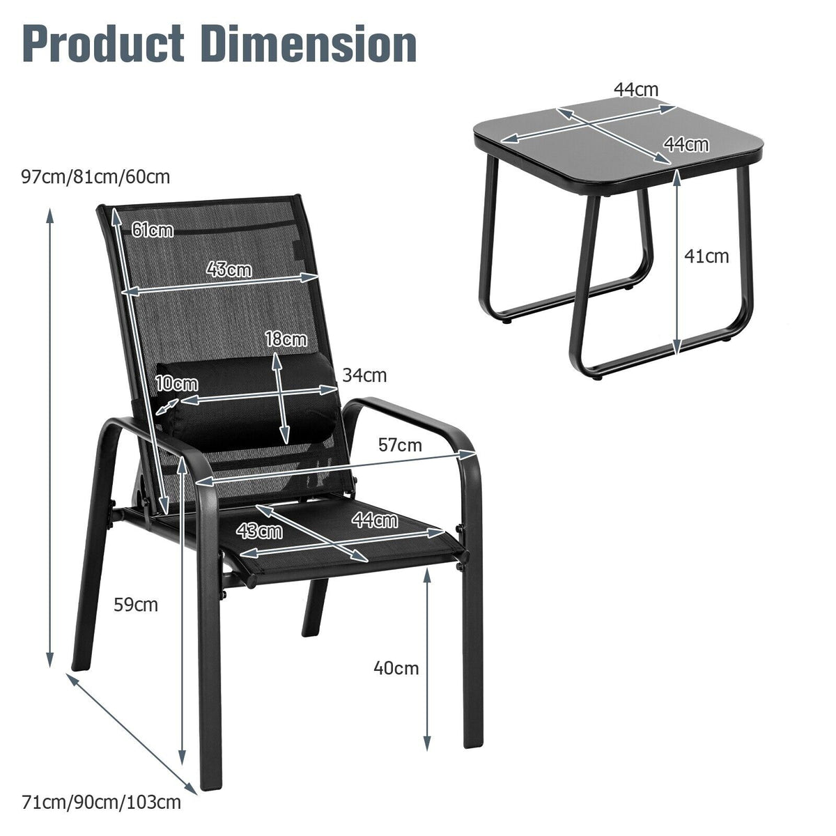 Colour: Black/Grey Material: Steel, Fabric, Tempered Glass Unfolding Dimension of Each Chair: 71/90/103 x 57 x 97/81/60 cm (L x W x H) Overall Dimension of Table: 44 x 44 x 41 cm (L x W x H) Overall Dimension of Each Headrest: 34 x 18 x 10 cm (L x W x H) Seat Height from the Ground: 40 cm Net Weight of Each Chair: 6 kg Net Weight of Table: 5 kg Weight Capacity of Each Chair: 150 kg Weight Capacity of Table: 50 kg Box Qty:1(May vary by batch)Package Includes: 1 x Table 2 x Chairs 2 x Headrests 1 x Instruction