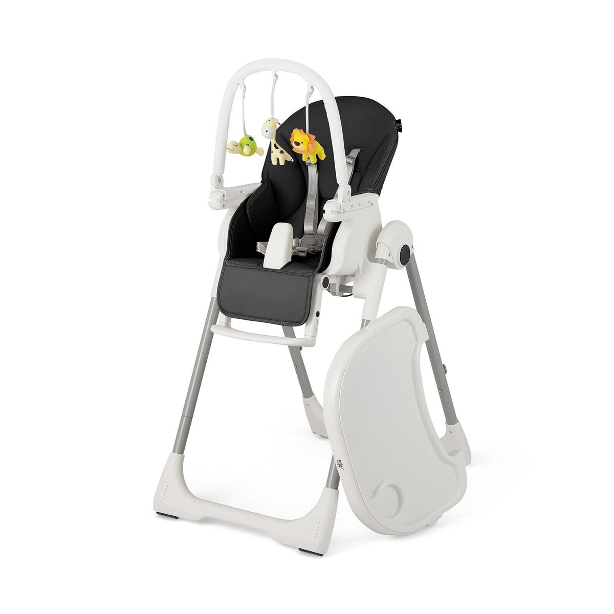 With adjustable height, backrest, footrest and tray, this convertible baby high chair provides your baby a comfortable position for eating, feeding, playing, etc. More, this baby feeding chair is featured with a removable toy bar which can promote baby’s visual development and exercise grasping ability. Convertible Baby High Chair: This multifunctional high chair will meet different needs of parents as their child growing from infant to toddler, suitable for independent eating, feeding, playing. In addition, the included toy bar is helpful to promote your baby's visual development and exercise grasping ability. Multiple Flexible Adjustment: This foldable baby high chair is designed with lots of adjustable parts: 7 heights, 4 reclining angels, 3-position tray, 3-angle adjustable and 3-length retractable footrest. So babies will enjoy a comfy position in various usage scenarios as well as during their growth. Suitable age: 6-36 months. Easy Folding and Movement: The baby highchair can be folded into a compact size by pressing the fold button on both sides, allowing for convenient storage and transport. Besides, the removed tray can be fixed on the rear legs using tray hooks. 2 smooth wheels make movement effortless and are lockable to keep the chair still. Removable Double Tray and Cushion: The upper tray with cup holder is ideal for eating while the lower tray can be used for playing, reading, etc. And both trays are removable and dishwasher safe, which effectively simplifies cleaning process. The seat cushion is featured with waterproof surface and is also removable for regular cleaning. Safety Always Comes First: Certified by EN71, parents can buy with confidence. The food trays made of food grade PP material is fully BPA free, and the soft PU seat cushion is skin-friendly to baby’s sensitive skin. The triangular structure is more stable while the 5-point safety harness and anti-falling barrier add more safety.
