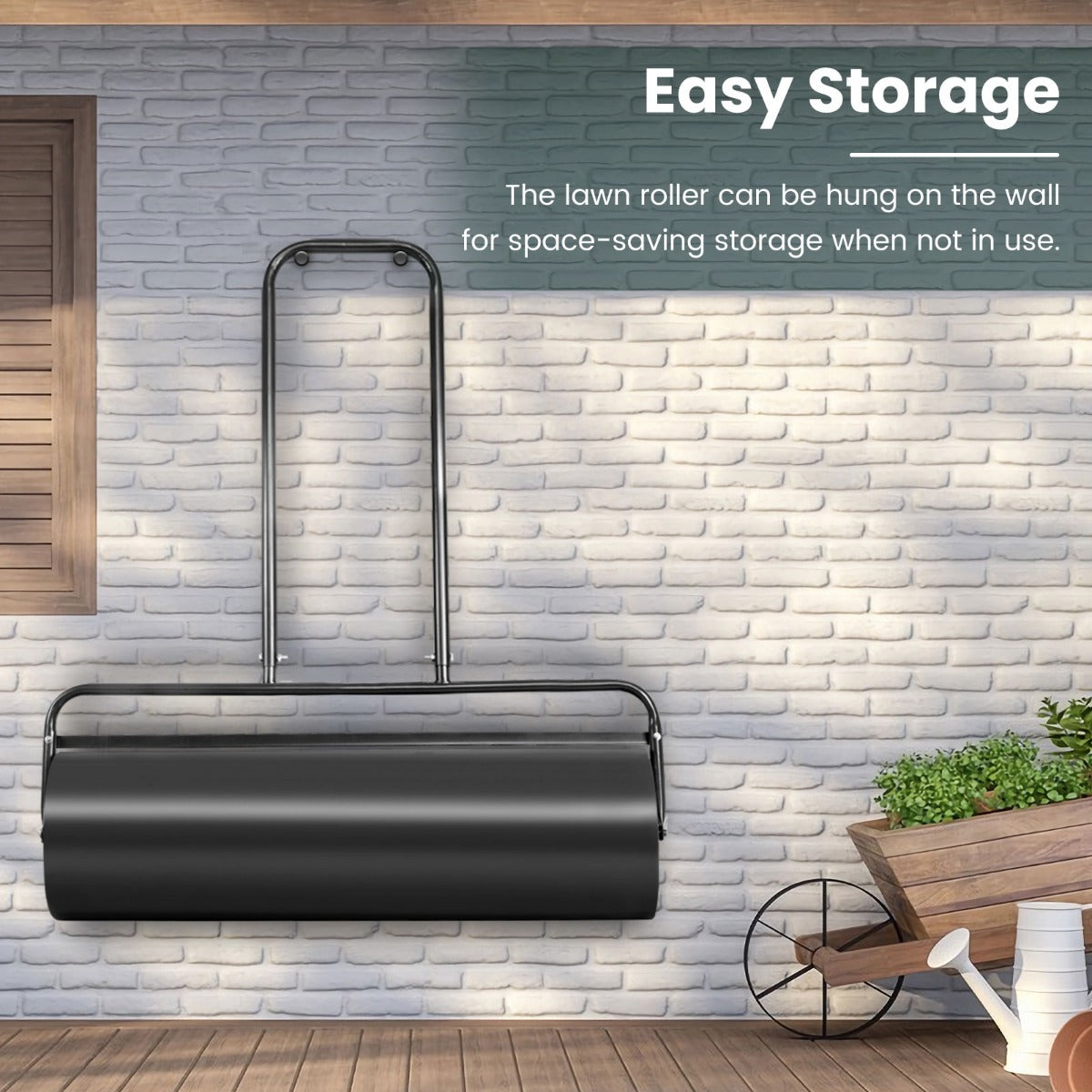 The 48L lawn roller is perfect for using in your patio and garden. Before planting new grass seed, the lawn roller can help level uneven ground. After seeding, the rolling helps speed up germination by ensuring that seeds make contact with soil. Moreover, the sod roller is designed to give you convenient using experience. The U shaped handle makes the rolling easier to pull and push. While made of steel material, the rolling is lightweight so that you can store and transport it easily. Don’t hesitate to buy this lawn roller to make your lawn more beautiful and premium. Ideal for Large Lawn: The lawn rolling machine, with rolling width, not only can erase damage by moles and frost heaves, but also can pack down loose dirt, newly sewn seed or sod, which improves the quality of your lawn. It is perfect for achieving an even and smooth lawn. Premium Material: Manufactured with high quality steel frame, the sturdy drum is durable to even sod in front of your house. Besides, the lawn roller is protected with surface paint to prevent rusting and fading. Therefore, this lawn roller will give you years of worry-free use. 48L Large Capacity: With large capacity, the sod roller, holding up to 48L of water sand or cement, is heavy enough to press the raised lawn back to its original position so that the loose rhizomes are closely integrated with the underlying soil. Humanized Design: Convenient push and tow-behind design provides versatility for rolling tight areas. In addition, the U shaped handle make operation more convenient. What’s more, the rounded drum edges help avoid damage to your lawn during turns. Easy for Storage and Transport: The lightweight lawn roller can be easily transported when it is empty. Other than that, when finishing rolling your lawn, you can simply drain and hang this compact roller in your garage or shed, which occupies minimal space.