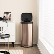 With a generous capacity of 68L, the garbage bin fits perfectly in any corner space. The lid is not only sealed tightly to trap odors from rotting food waste, but it also features a built-in deodorizer compartment for a fresher environment. Say goodbye to noisy bangs, as the trash can boasts a soft closing mechanism that ensures a quiet operation. Planning a big cleaning session? No problem! The stay-open design allows for hassle-free disposal during longer chores. Crafted with a 3-layered stainless steel structure, the trash bin is built to last. The stainless steel layer is resistant to deformations, while the anti-fingerprint layer maintains a smudge-free appearance. Moving the trash can is a breeze, thanks to the convenient back handle. Its anti-slip base keeps your floors scratch-free. No assembly required - this garbage bin is ready to use upon arrival and even includes a waste bag ring for easy and secure bag replacement. If you are looking for such a product, do not hesitate to buy it! Large Capacity and No Odors: The trash can offers you up to 68L large capacity even though it only takes up a corner space. Moreover, its lid features a perfectly sealed design and it contains a built-in deodorizer compartment, both can help block or trap odors from rotting food waste. Soft Closing and Stay Open: To free hands, the garbage bin is operated with a pedal for smooth opening, while its silent close lid realizes soft closing to eliminate banging. Besides, the trash can comes with a stay-open design, which is perfect for longer chores. Stainless Steel Structure: The step-on trash can boasts a 3-tiered frame for better strength and durability. Its stainless steel layer is strong enough to resist deformations, while the drawing wire layer and anti-fingerprint layer ensure perfect smudge resistance to keep a shiny look. Easy Moving and Wide Use: With a back handle, the movement becomes much easier. As needed, the trash can can be placed in the kitchen, dining room or office to keep room clean. Plus, it is fitted with an anti-slip base, which will promote stability and avoid scratching the floor. No Assembly and Easy to Use: For convenience, the garbage bin is ready to use straight out of the package, no installation needed. For daily using, it comes with a waste bag ring that will securely keep your bag in place and make bag replacement convenient.