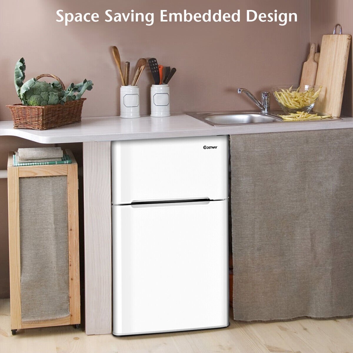 Do you want to keep the cola cool and meat frozen? The 2 door refrigerator is a great choice for those looking for a fridge/freezer appliance. The machine quickly cools down with low noise, providing excellent cooling performance with minimal power consumption. What are you waiting for? Do not hesitate to buy one! Adjustable Temperature and Interior Light: The undercounter refrigerator will maintain the temperature level you choose, which can be adjusted from 7 positions. With the mechanical temperature control, you can set the temperature in the range of 0℃ to 10℃ and the lowest freezing temperature is -15℃. The built-in LED light provides great convenience for you to get what you need at night. 2 Door Design and Large Capacity: This 2-door refrigerator has 2 storage zones at the same time. 27L freezer can be used to store ice cream or frozen foods, while 63L fridge can be used to preserve fresh fruits or vegetables. And the door storage offers more vertical space to keep beverages. Besides, the removable glass shelves and pull out crisper drawers keep food separately and organized without mixing. Powerful Performance and Energy-saving: Equipped with efficient R600a compressor, this compact fridge can quickly and quietly realize powerful cooling performance, which will keep ice frozen solid and foods perfectly chilled. Besides, our refrigerator can reduce consumption of energy and protect from harmful chlorofluorocarbons. Reversible Door and Adjustable Feet: The design of the reversible door makes the freestanding under counter fridge freezer suitable to be placed in various positions in the room, giving you more choice in the direction of opening the door. Additionally, the adjustable foot pads allow the refrigerator to be placed horizontally on the ground in a stable condition. Quiet Operation and Compact Design: The standard mini fridge works in low noise, which is below 42dB, offering you a calm sleeping or working environment. What’s more, this compact mini refrigerator is perfect for smaller areas such as student dormitories, wet bars, apartments and condos.