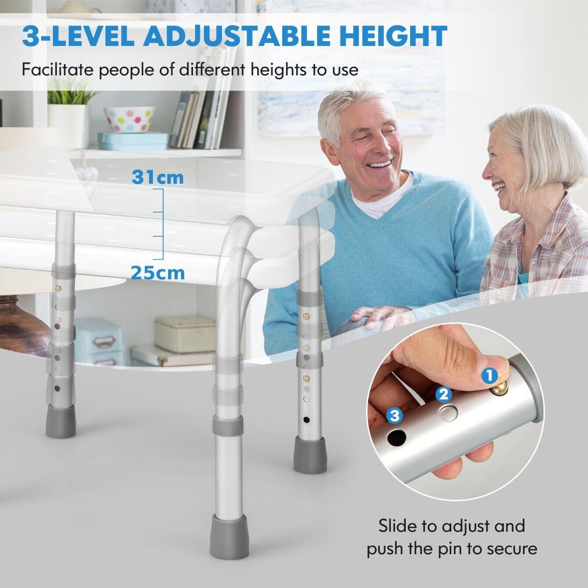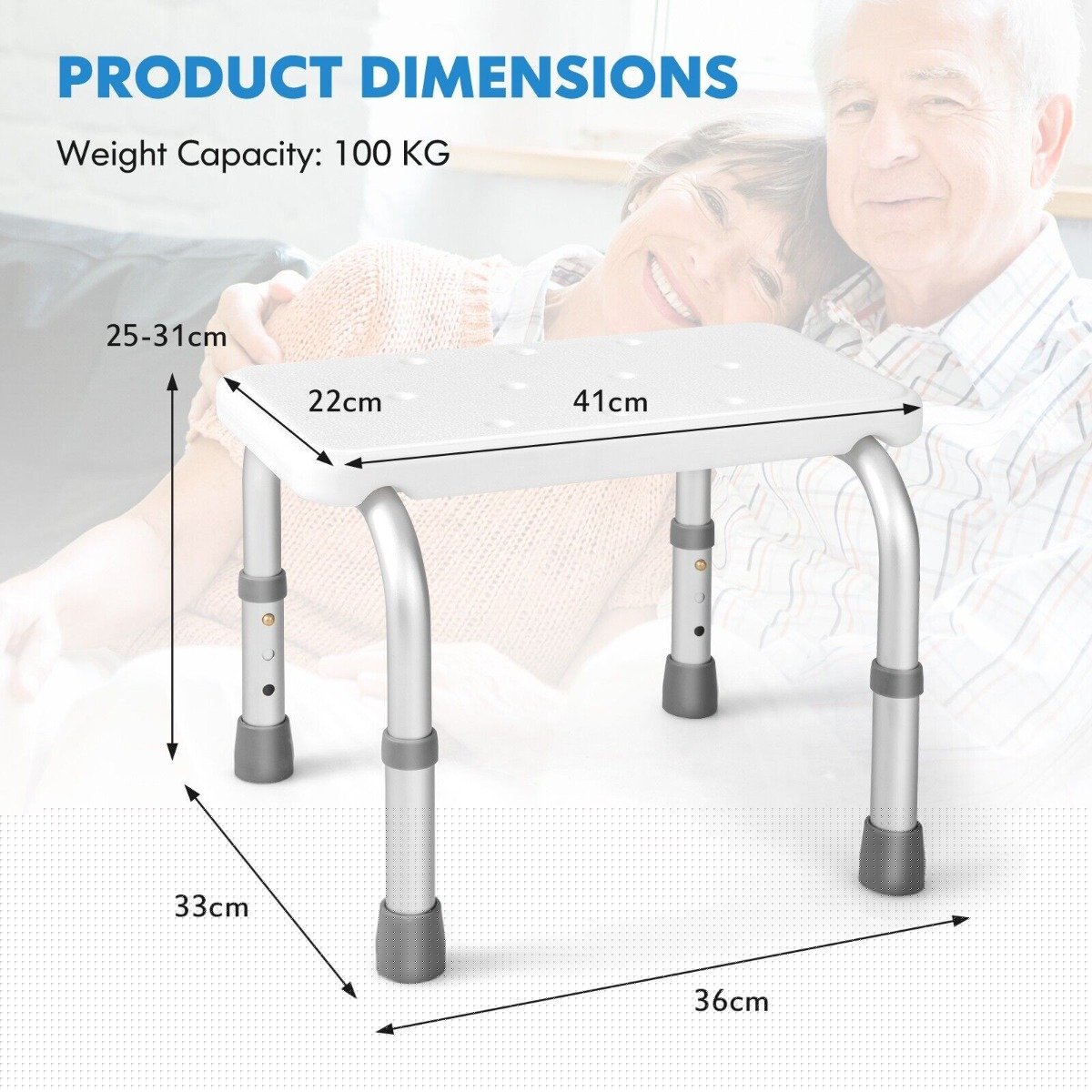 Color: Silver, white, grayMaterial: Aluminum alloy, rubber, plastic, foamOverall dimensions: 36 x 33 x 26-31 cm (L x W x H)Seat height: 26-31 cmSeat size: 41 x 22 cm (L x W)Weight capacity: 100 kgNet weight: 1.5 kg Box Qty:1(May vary by batch)Package Includes:1 x Bath chair1 x Instruction manual