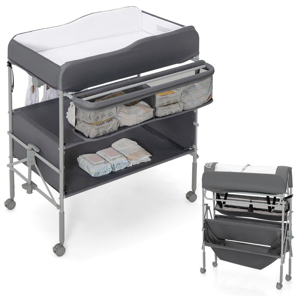 Featuring a 4-level height adjustment and large storage compartments, this diaper changing table is a great helper for diaper changing and baby nursery. It can free you from bending over to change diapers, greatly reducing the burden on your waist and back. The side storage basket & clothes rail and bottom open shelves can store plenty of stuff, like diapers, feeding bottles, tissues, baby’s shoes, clothes, toys, etc. The diaper changing pad made of waterproof and wear-resistant PVC fabric is easy to wipe clean. What's more, the 4-sided fence and safety belt help keep the baby in a safe state all the time. 4 lockable and smooth rolling wheels make it easy to move to any place you want. When not in use, you can easily fold this infant nursery organizer to put in the corner. Perfect Gift for Newborn Parents: Designed with 4 adjustable heights, this baby changing table is suitable for parents with different heights. Thanks to the scientific height design, there is no more bending over to change diapers. Besides, the height gauge on the diaper changing pad surface is convenient for parents to record the baby's growth!Large Storage Space: Equipped with a 2-compartment storage basket, a side clothes rail and 2-tier open shelves at the bottom, this portable nursery organizer provides ample space to hold all the baby essentials and keep them at reach. You can place diapers, baby powder, feeding bottles, clothes, towels, toys, etc.Portable Design and Safe Use: This diaper changing station features a quick folding design for easy storage and transportation. Just hold the handle, turn left and lift it up, and then press the button on both sides to fold it. Moreover, the 4 heightened sides around the tabletop offer 360° safety protection for the baby.Selected Material and Stable Structure: Made of waterproof & anti-wear PVC fabric, the diaper changing mat is durable and easy to clean. In addition, the inside thick and heavy-duty PP supporting plate provides great support to the baby when lying on it. Moreover, the sturdy and rustproof powder coated steel tube frame ensures high stability and durability.Versatile Use and Easy Movement: This baby changing unit can be used not only for changing diapers and clothes, but also for massage and nursing, hanging clothes, storage and more. Equipped with 4 lockable, 360° rotatable and wear-resistant wheels, this portable diaper changing station is easy to move from room to room.
