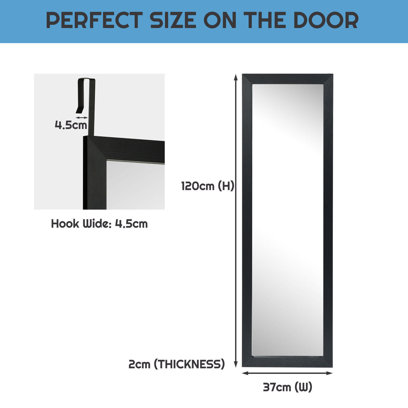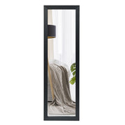 Color: Black Material: MDF + Mirror Product Dimensions: 120 cm (L) x 37 cm (W) Net Weight: 4 kg Box Qty:1(May vary by batch)Package includes: 1 x Hanging Framed Mirror for Door & Wall 1 x Instructions