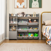 With 4 large and 4 small storage boxes, along with side shelves and a cabinet, this organizer is perfect for keeping your child's belongings neatly organized and easily accessible. Designed with your child's safety in mind, it features opening and sloping storage bins for easy access without the risk of injury. The rounded corners and soft close hinges ensure a safe environment, and the included anti-toppling device keeps the organizer stable and secure. Teach your child the importance of storage and watch as they develop good habits of cleanliness and organization. Ample and Classified Storage Space: This multifunctional organizer provides plenty of storage space for toys, books and more. With 4 large and 4 small storage boxes, along with side shelves and a cabinet, it's perfect for keeping your child's belongings neatly organized and easily accessible. Safety Design for Kids: Designed with your child's safety in mind, this toy organizer features opening and sloping storage bins for easy access without the risk of injury. The rounded corners and soft close hinges further ensure a safe environment. Plus, the anti-toppling device is included to keep the organizer stable and secure. Keep Room Clean and Organized: Say goodbye to cluttered rooms! This kids bookshelf helps promote a clean and organized space by providing designated areas for different items. Teach your child the importance of storage and watch as they develop good habits of cleanliness and organization. Wide Application: This versatile organizer is not limited to just toys. It combined the function of bookshelves, toy bins and a cabinet, which makes it suitable for various scenarios such as living room, play room and kindergarten. Easy to Assemble and Maintain: With detailed instructions and labeled parts, assembling this toy storage organizer is a breeze. The waterproof surface can be easily wiped clean with a wet cloth, ensuring hassle-free maintenance.