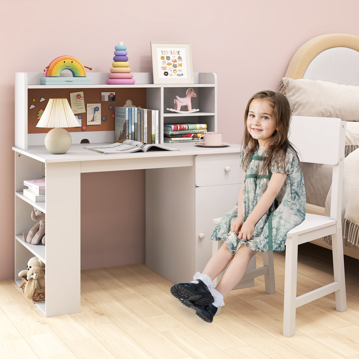 Kids Desk and Chair Set with Chair Hutch and 3-Layer Side Shelf-White