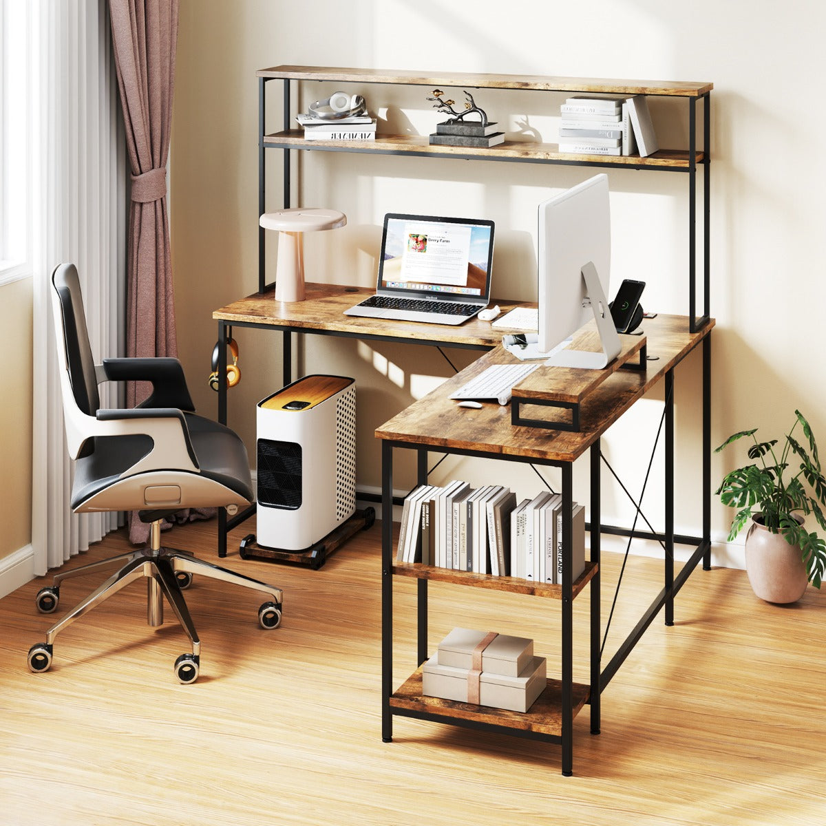 Colour: Rustic Brown & Black/Black/Gray Material: Engineered Wood, Metal Overall Dimensions: 145 x 145 x 147 cm (L x W x H) Dimensions of Monitor Stand: 63 x 17 x 9 cm (L x W x H) Dimensions of CPU Stand: 45 x 25 cm (L x W) Width of L-shaped Tabletop: 50 cm Length of Long Straight Tabletop: 240 cm Height from Tabletop to Ground: 75 cm Height Between Storage Shelves: 31 cm Height of Top Shelf: 72 cm Width of Top Shelf: 20 cm Adjustable Range of Top Shelf: 15 cm 4 Outlets: 250V 13A 50Hz USB Port: 12V 1.5 A Max. Type-C Port: 12V 1.67 A Max. Effective Control Distance: 30 m Net Weight: 34 kg Weight Capacity of Tabletop: 141 kg Weight Capacity of Each Shelf: 20 kg Box QTY: 1(May vary by batch) Package Includes: 1 x L-shaped Desk 1 x Instruction Manual