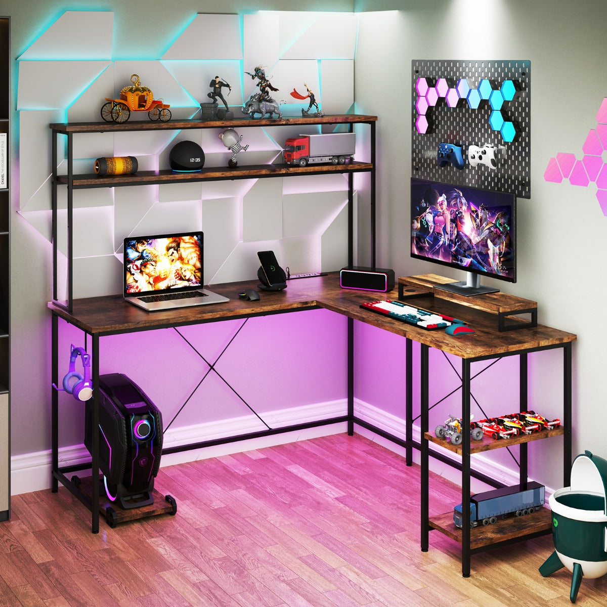 Equipped with built-in LED strip, this home office desk enhances your gaming experience or work environment with customized ambient lighting. Additionally, the integrated charging station provide flexible power source for your gaming gears. The ergonomic monitor stand provides a comfortable viewing angle. The top hutch, spacious shelves, headphone hook, and a computer host stand are designed for organized equipment placement. Besides, 2 cable management holes prevent tangling and clutter. This reversible computer desk can be configured either as an L-shape for corners or as a long straight desk. For reliable structure, the computer workstation is supported by heavy-duty metal frame and adjustable foot pads. Immersive LED Light Strip: The L-shaped desk features an ambient LED strip that provides a dynamic light show, enhancing the atmosphere and immersion of your gaming experience. The remote control makes it easier to adjust light colors, modes, brightness and speeds. Functional Power Strip and Monitor Stand: The computer workstation comes with 4 AC outlets, a USB and a type-C port that provide multiple charging choices for your devices. Besides, the removable monitor stand raises your screen to eye level, thus to reduce neck strain. Perfect Working Spot: Along with a spacious L-shaped tabletop, this computer PC desk offers a 2-position adjustable hutch, headphone hook, CPU stand, and storage shelves for an organized workspace. Plus, 2 cable management holes keep wires tidy and clutter-free. Reversible Design: The L-shaped gaming desk can be set up as a long straight design, which allows you to customize the layout to fit your space. Ideal for gaming, studying or working, this home office computer desk caters to your needs. Sturdy and Stable Structure: The heavy-duty metal frame ensures durability and strong load bearing, supporting your gaming or work activities without any wobble. Besides, Adjustable foot pads enhance stability and protect your floors from scratches.