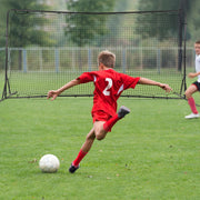 Designed with a substantial 375 cm x 185 cm surface, this rebounder net is perfect for group practices at any level. Furthermore, the net is crafted from selected PE, standing up to all weather conditions. Fortified by a triangular base and anchored with ground stakes, the robust metal structure provides utmost stability. The soccer training equipment is an ideal gift that supports healthy and active play, encouraging children above 6 years to develop soccer skills and social skills. Plus, with carrying bag, moving the kids soccer goal is a breeze. Expansive Playing Surface: Measuring 375 cm x 185 cm (L x H), the soccer rebounder net offers kids generous play area, allowing them to practice from varied angles. And the net can be used on both sides, suitable group play. All-Weather Durability: Built with premium PE netting, the soccer goal net is resilient against rain, sun, and robust play, enduring endures through every season. It promises longevity and consistent performance. Outstanding Stability: The soccer training equipment boasts a sturdy metal construction and is supported by a stable triangle-shaped base and rubber feet. Besides, the ground stakes ensure it resists tipping and wobbling. Perfect Gift for Young Athletes: The soccer net is suitable for kids over 6 years old, encouraging active play and sportsmanship. It is a gateway to healthy outdoor activity and helps enhance motor skills, hand-eye coordination, confidence etc. Easy Assembly and Carry: With marked pipes and bungees, the assembly is a breeze and doesn't even require tools. In addition, the package contains a carrying bag, enabling you to conveniently carry and store the soccer bounce back net.