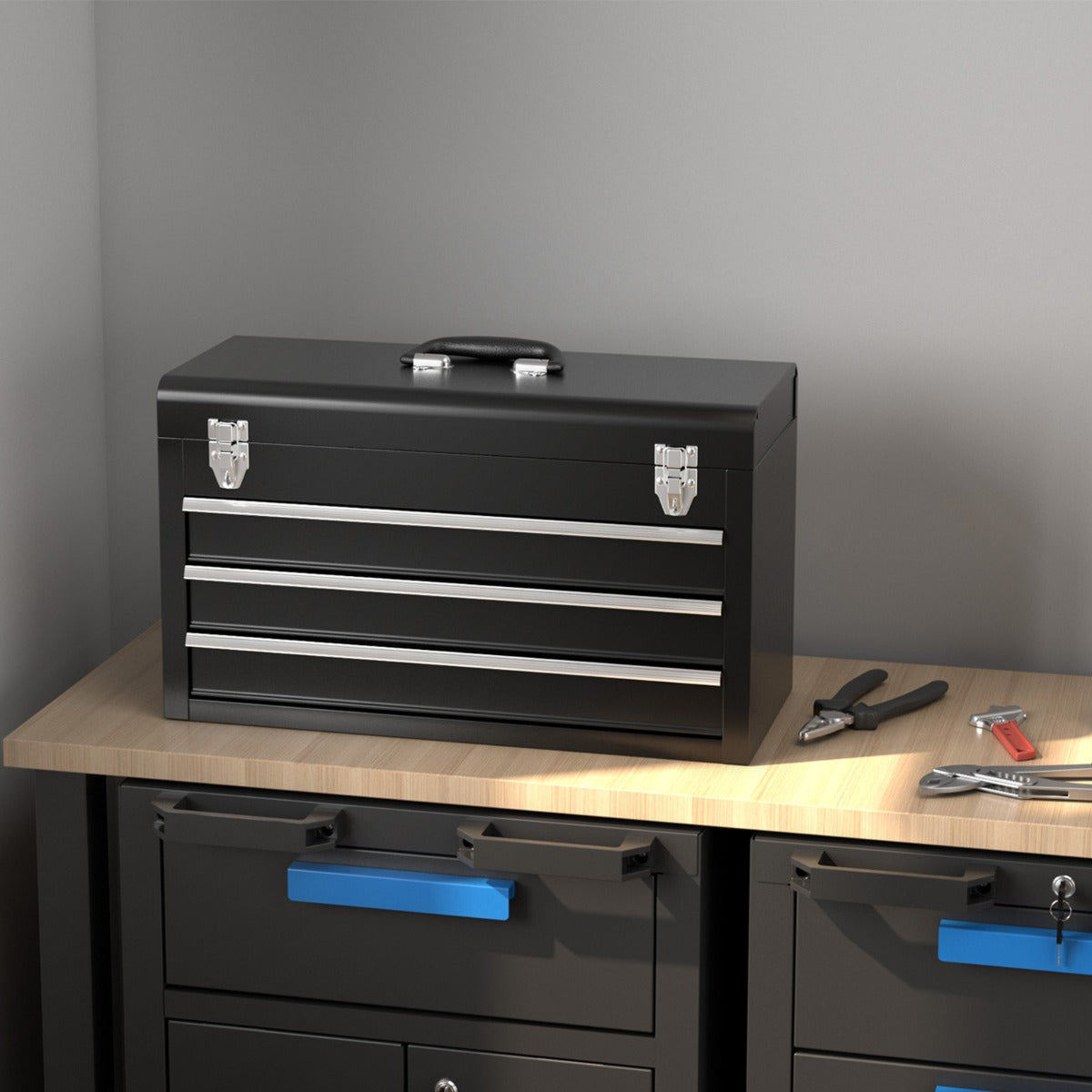 Portable Steel Tool Box with 3 Drawers and Top Storage Tray-Black