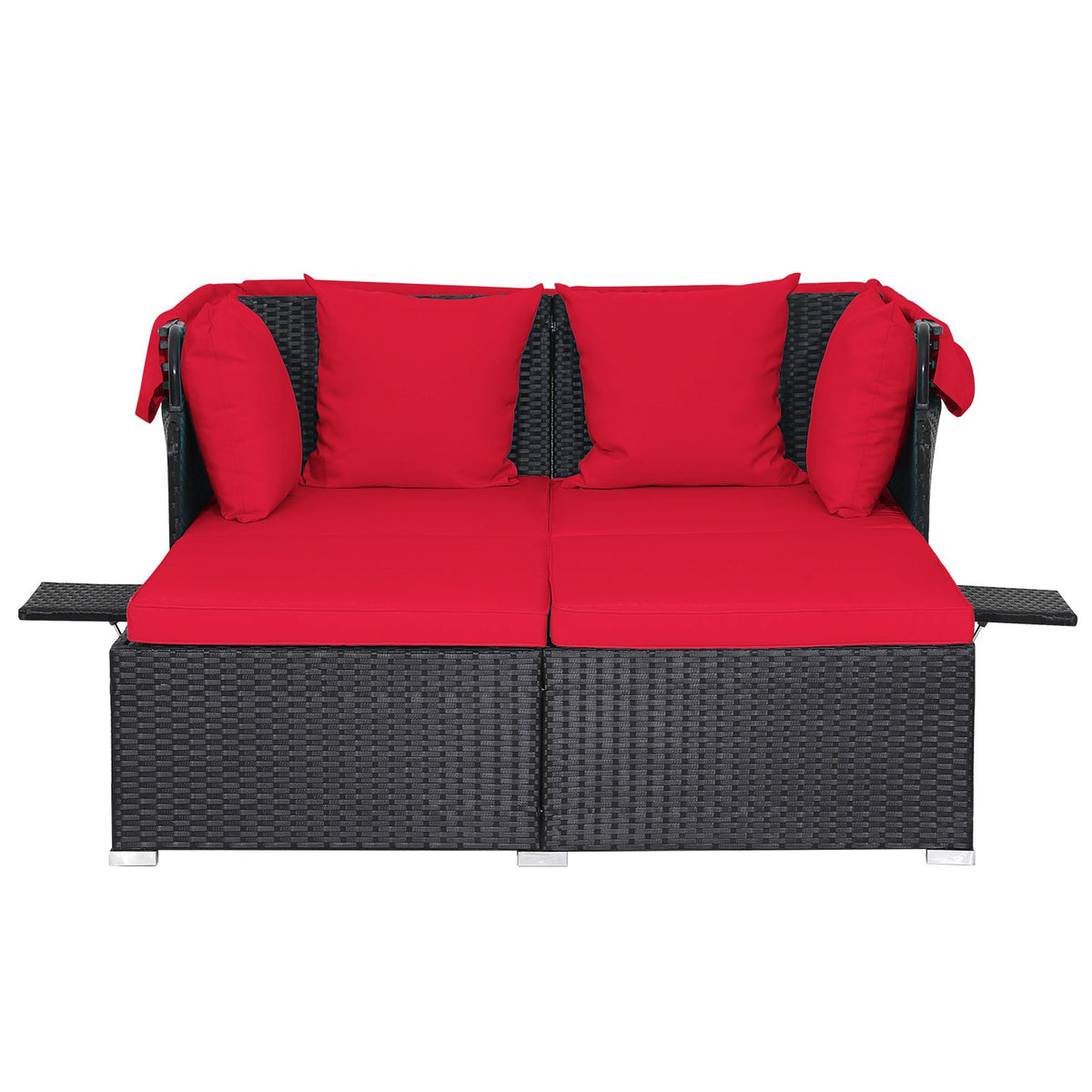 Start your outdoor relaxation from this patio hand-woven rattan wicker daybed! Measuring large size of lying area and weighing 360kg in weight capacity, this outdoor daybed is large and stable enough to hold 2 people at the same time. Moreover, the soft and thick seat cushions and throw pillows make the lying experience more comfortable. In addition to retracting the canopy for resting or sunbathing, the retractable side tables allow you to keep items close to hand, such as phone, drink, magazine and more. When you use this patio sofa bed outdoors, the sun-protective hand-woven PE wicker and rustproof steel frame ensure higher durability. Retractable Canopy and Folding Side Tables: This outdoor daybed features a retractable canopy with fixed ropes that allows you to read and rest under the shade or just enjoy the sunbath. When the canopy is retracted, it needs to be fixed with ropes. Likewise, the side tables on both sides are retractable as well to make needed close to hand. All you need to do is use the pneumatic rod for safe and easy adjustment. All the Comforts, All for You: Padded with high-density sponge, the 2 seat cushions and 4 throw pillows are soft and thick enough for a better lying experience. Meanwhile, the large lying area with 360kg weight capacity is capable of accommodating 2 people at the same time to share the happy moment. Durability and Stability Are All in Here: Constructed of sun-protective and fade-resistant black hand-woven PE rattan wicker as well as supported by the rustproof and sturdy steel frame, this patio daybed is durable and stable enough to fit the outdoor environment. Besides, the extra support legs and non-slip foot pads ensure additional stability. Note: Please do not tighten all the screws until all the holes are aligned. More Places, More Pleasures: Thanks to its versatile design and modern appearance, this outdoor sun lounger greatly matches your different places, such as patio, garden, lawn, poolside and backyard. The rattan sun bed sofa allows you to spend outdoor leisure time with your beloved anytime, anywhere. Maintenance and Tips about Cushions: Each cushion and pillow comes with zippered design, which is convenient for you to remove and clean the cushion/pillow covers. Tips: 1) Please always keep cushions and pillows dry to prolong the service time. 2) Due to the light avoidance and light exposure, the color of the cushions is slightly different.
