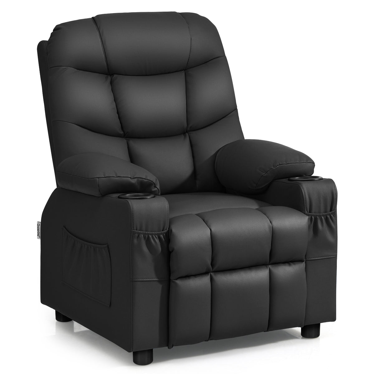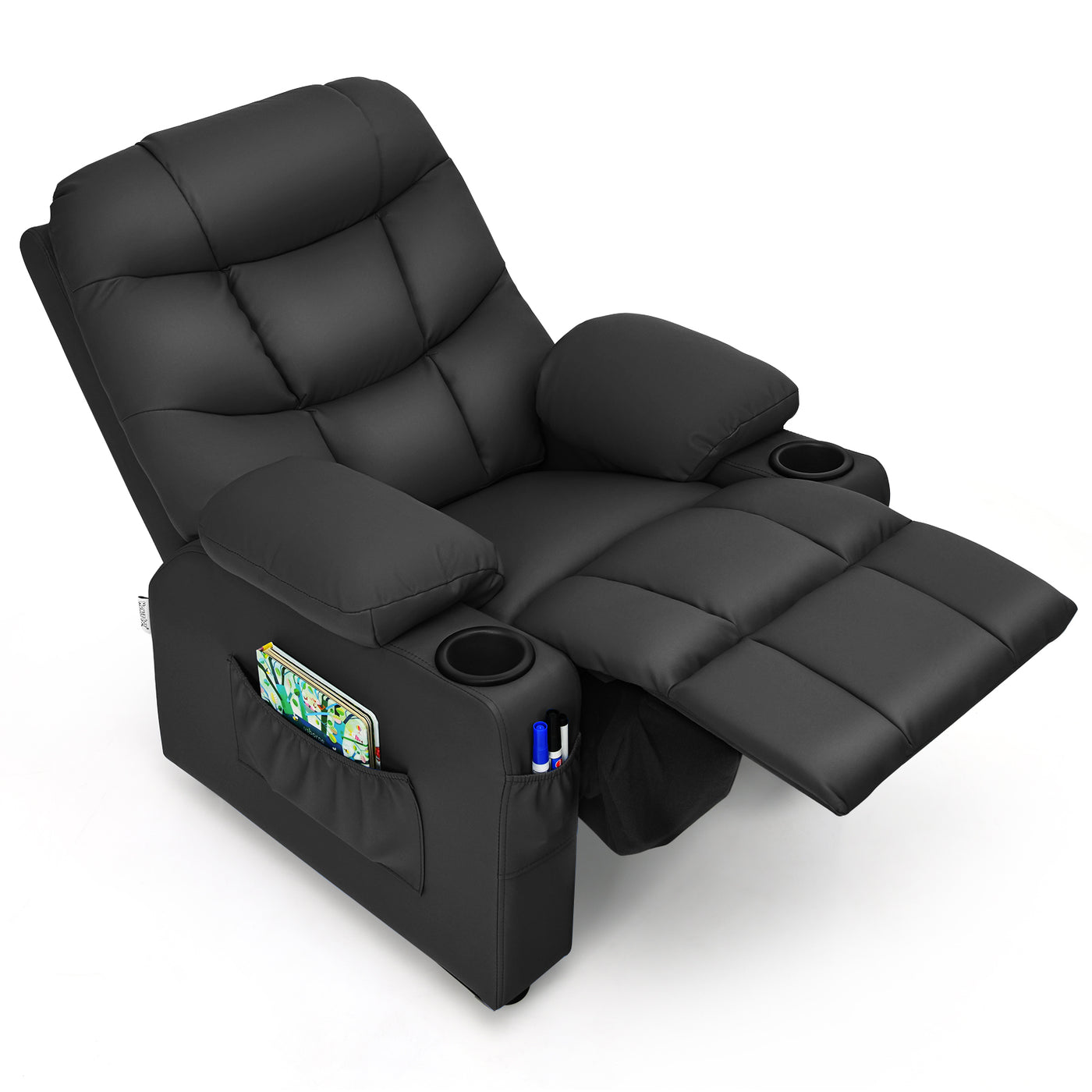 This recliner is easy to operate for sitting or lying by adjusting the backrest and footrest, so as to meet kids’ different needs of reading, watching TV, napping, etc. Waterproof PU leather, sturdy solid wood frame and thick sponge padding ensure that the chair can withstand long-term use. Featuring an ergonomic high backrest and wide armrests, this sofa will offer extra comfort and relaxation. It is also worth mentioning that this recliner is designed with cup holders and side pockets, allowing kids to put water cups, snacks and books within reach. Selected Materials and Stable Structure: The surface of this kid’s recliner is covered with high-quality PU leather, which is skin-friendly, breathable and easy to clean. The sturdy solid wood frame enables the recliner to withstand up to 80kg of weight without collapsing. Besides, 4 anti-slip feet ensure that the chair can stand stably on the floor. Adjustable Backrest and Footrest: Featuring a smooth pushback mechanism, the backrest can be reclined up to 130°. Children can sit up straight to read a book or watch TV, or lie down to take a nap. When kids lean back, the footrest will pop out and fully extend, allowing their feet to be well rested. Convenient Cup Holders and Side Pockets: The armrests on both sides are designed with a cup holder, which can put the kids’ water cups within their reach, so that they can be hydrated in time when they are thirsty. In addition, one large side pocket and two small front pockets are convenient for storing children's favorite books and snacks. Comfortable Ergonomic Design: This kid’s recliner is ergonomically designed with a high backrest and wide armrests for extra support to relieve sedentary fatigue. Soft and thick sponge-padded seat provides an ultra-comfortable sitting feeling, allowing children to get full relaxation. Ideal Gift for Kids: This recliner chair is the ideal choice for kids to spend their leisure time. It is larger than other products on the market and is suitable for children over 3 years old. The simple and modern design makes it suitable for a variety of places, such as children's room, living room and bedroom.
