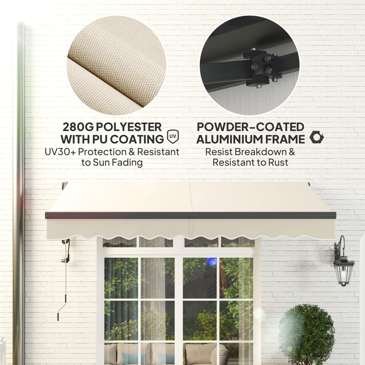 Sun protection where needed above doors or windows, with this Outsunny 2.5 x 3 m electric awning. Can be used with the both the remote control or manually with the hand crank. The aluminium frame means a strong core, resistant to rusting for extended use. The 280g/m² polyester canopy blocks harmful UV rays. Tilts between 45° to 85° to block weather at different times of the day.