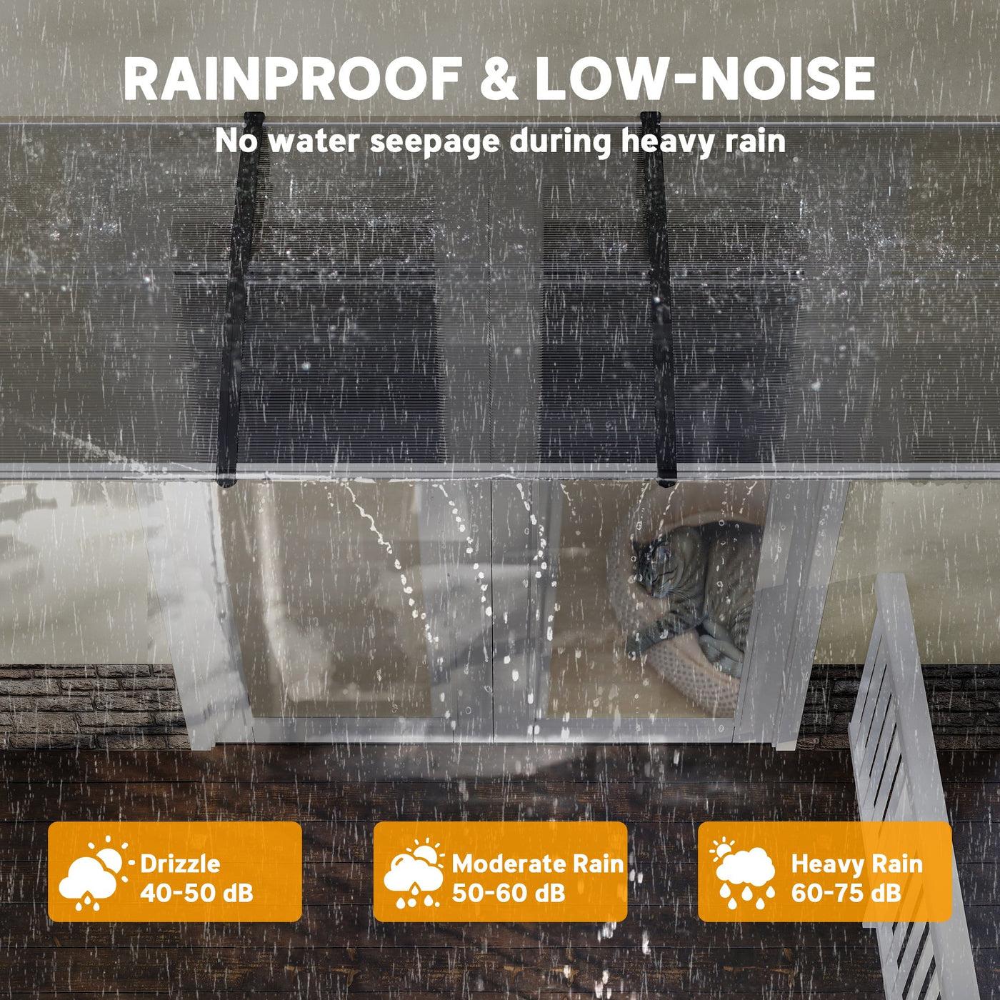 Keep the elements away from your doors and windows, all year long with this Outsunny three-panel double awning. Curved shape covers a larger area, whilst preventing any build-up on the end half. The aluminium frame is strong so it holds on place; it can be easily mounted on the wall with all required accessories included in the package. Each panel features a UV-resistant coating for protection against damaging rays - whether it's sunny, gentle snow, moderate breeze or light-medium rainy.