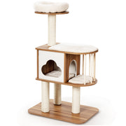 Featuring high perch and sisal posts, this cat condo fills the natural instincts of cats climbing and grinding their claws. The posts have inner pillars made of pine wood for durability and stability. The condo and the platform are covered with comfortable pads while a plush cat bed rests on the perch, guaranteeing that cats rest with comfy. All the cushions are machine washable for easy maintenance. It is both a sweet home for cats and an outstanding modern decoration in your home. If you are looking for a cat condo like this, do not hesitate to place an order! Practical Modern Cat Tower: Designed with multiple activity space, this modern cat tree meets your feline friends’ lively and active nature for having fun in order to consume their energy. In addition, your little cats can go to the second-floor condo to rest after playing. 4-Layer Platforms: On the top layer, your little kittens can look out of the window and enjoy a sunbath on sunny days. And the second and third platform allows your cats to rest and relax with the soft cushion. Besides, 3 scratching posts on the bottom floor help your furry friends to sharpen their nails. Durable Construction: Thanks to its sturdy engineered wood, suitable height and strong base, this high-quality cat tree is extremely stable which can withstand your furry friends jumping in or out to avoid shaking. And wooden sticks on the second platform protect your cats from falling. Nice Looking Cat Tree: Coming with a practical design and beautiful appearance, this cat tower with wood texture makes a timeless addition to your home décor which is suitable for living room, bedroom, balcony and other places, providing a comfortable activity center for your little kittens. Protect Your Home: With durable and wear-resistant sisal ropes, this premium cat tower satisfies your feline friends’ instinct of scratching while preventing your furniture from damage. And the cushions are soft for maximum comfort and can be removed for washing.
