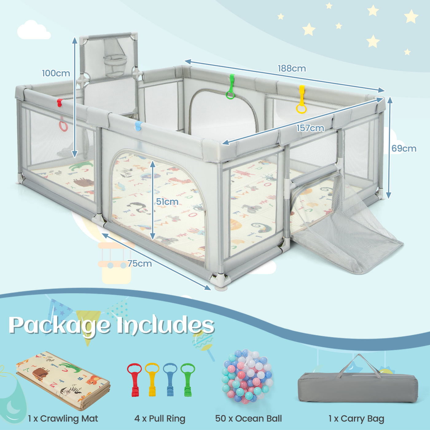 Large Baby Playpen with Mat and Ocean balls-Light Grey