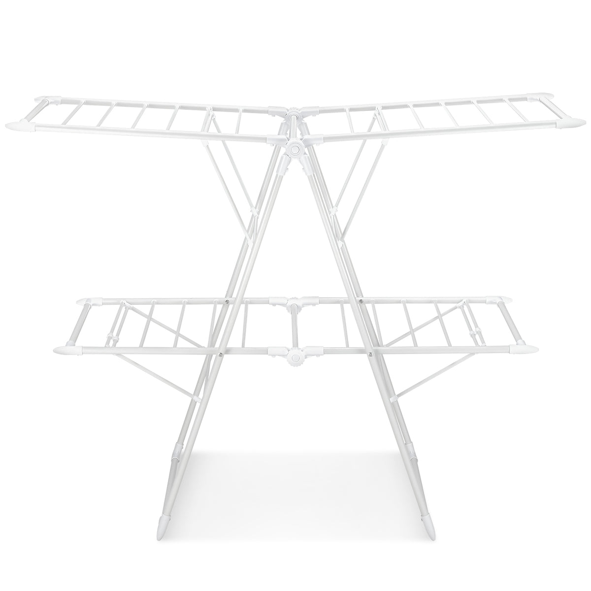 The perfect solution to clothes drying! Equipped with 4 wings and 28 rails, this 2-tier laundry drying rack can meet the clothes drying needs of the whole family. In addition, the top 2 wings can be easily adjusted to 3 heights to dry skirts, pants, sheets and more. The fixing buckle and connector help to keep the wings in place. Crafted from rustproof and waterproof powder-coated steel tubes, this clothes drying rack ensures great stability and long-lasting use. What's more, the laundry drying rack is easy to open and fold up for easy storage. You can store it beside the washing machines or any corner when not in use to save space. 2 Tiers, 4 Wings and 28 Drying Rails: This 2-tier laundry drying rack is equipped with 4 wings and a total of 28 rails, offering large drying space for your clothes, towels, sheets, socks, shoes, underwear, kids' clothes, etc. 3-Level Adjustable Wing Height: The top 2 wings of this freestanding clothes drying rack features 3 adjustable heights (38.5"/98 cm, 44.5"/113 cm, 50.5"/128 cm) to fit different types of clothes. Foldable and Portable Design: Due to the quick folding design, this clothes drying rack is easy to store and can save plenty of space when not in use. Besides, the lightweight design allows you to transport it to the laundry room or the patio with ease. Durable and Stable Construction: Made of powder-coated steel tubes, this laundry drying rack is strong, waterproof and rustproof, ideal for indoor and outdoor use. Plus, the non-slip and anti-wear foot pads enhance stability and durability. No Assembled Required: You don't need to spend time on troublesome assembly. There are no tools required to set up this folding clothes drying rack. It is ready for use after being taken out of the box.