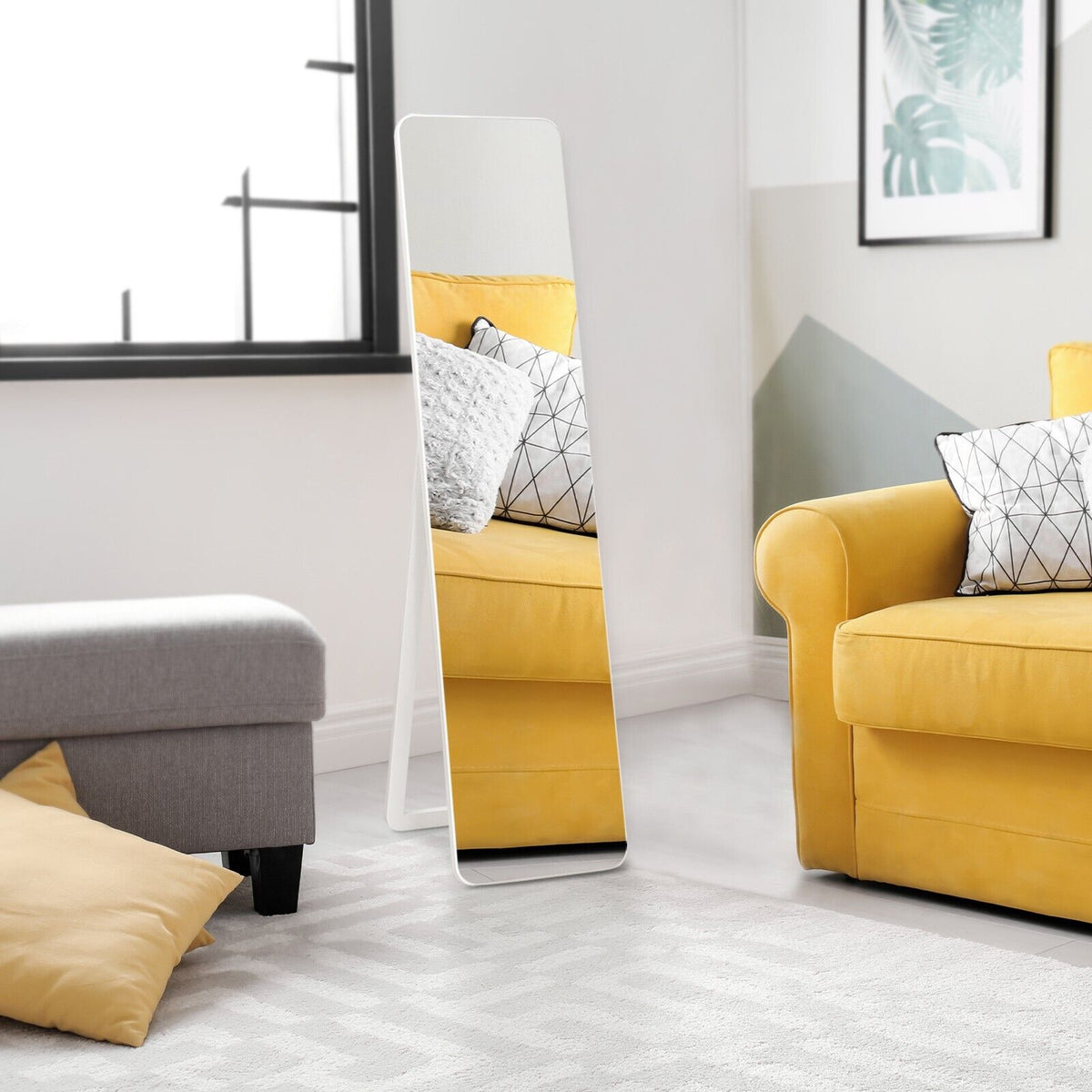 The solid wood frame is sturdy and durable without easy cracking. The glass with explosion-proof film provides HD imaging, and can prevent fragments from splashing when impacted by external forces. U-shaped bracket ensures that the mirror stands stably, and the foot pads at the bottom can prevent scratches on the floor. It's worth mentioning that with hooks and expansion screws included, you can also choose to hang our mirror on the wall to save space. In addition, the simple and modern appearance allows this mirror to be perfectly blended into the living room, bedroom, dressing room and other places.Floor Standing Mirror and Wall Hanging Mirror: This full length mirror has 2 ways to use, including standing on the floor and hanging on the wall. The sturdy U-shaped bracket enables this floor mirror to stand freely anywhere, and the foldable connecting hinge can adjust the standing angle. In addition, you can also use the attached hooks and expansion screws to hang the dressing mirror on the wall to save space.Full Length Mirror with HD Imaging: This 160 x 37cm full-length mirror provides a large field of vision, allowing you to perfectly display your outfit from head to toe. The full body mirror made of high-quality glass ensures high-definition imaging, which can restore your most essential beauty without any distortion.Reliable Safety Protection: Compared with ordinary mirrors, our glass features a protective explosion-proof film, which will not splash out fragments even impacted by external force, ensuring the safety of you and your family. In addition, the rounded corners can effectively prevent accidental injuries.Durable and Stable Frame: Featuring a sturdy solid wood frame, this full-length floor mirror has a long service life and is not easy to deform or crack. Besides, the bracket with anti-scratch foot pads ensures a stable standing while preventing damage to the floor.Wide Range of Applications: With a minimalist design and classic white finish, this wall mounted hanging mirror shows elegant charm and complements any decor style. Whether it is placed in the living room, bedroom, entrance or dressing room, the floor leaning mirror can attract the attention of guests and get compliments.