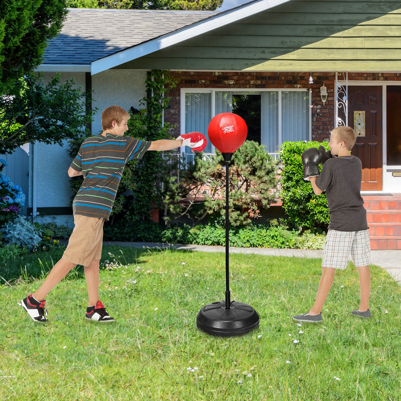 Do you want your child to improve their physical fitness? The box set is the ideal choice. The eco-friendly and soft gloves protect your children's hands from injury. The adjustable pole height is suitable for both children and teenagers. You can fill the base with sand or water to ensure stability. Adjustable Height: The height of the pole can be adjusted to the needs of different age groups from 122 to 154 cm and accompany the growth of your child. It also meets the needs of both adults and children for physical exercise and maintaining good health. High-Quality Material: The punching ball is made of PE and PVC, which is safe and environmentally friendly. Good workmanship ensures a long service life. Besides, the soft and breathable inner fabric of the gloves effectively protects children's hands from injury during exercise. Stable Base: The base of this boxing set can be filled with 14kg of water or around 23kg of sand to ensure high stability, while you can easily attach this set up without fear of tipping over, protecting your security. Improve Physical Fitness: Rapid rebounding trains children's reaction time and improves their physical performance. In addition, exercise is an effective stress-release and tension-reliever, and this equipment will maintain your child's health both physically and mentally. Easy Assembly and Transport: The complete accessories and removable parts make it easy for you to assemble and clean. The box set can be stowed away in a space-saving way. The base has a hollow handle for easy carrying. You can use the punching ball outdoors or indoors at any time.