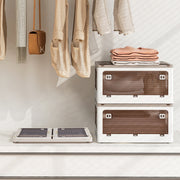 This 3-pack storage bin set is a game-changer, offering a whopping 34.5/24-gallon capacity combined! Perfect for stashing everything from winter wear to sports gear, it simplifies organization with 5 convenient access points, including a smart desiccant compartment to keep contents fresh. No tools? No problem! Set up is a breeze with this foldable, ready-to-go design. Maximizing your space? Stack them up or spread them out - however you like! Plus, moving them around is smooth and effortless with built-in wheels and handles. Click now to transform clutter into a tidy haven with this versatile storage bins! 34.5/24-Gal Capacity for Versatile Storage: The 3-pack storage bins offer ample space to effortlessly organize everything from clothing to collectibles. The 11.5/8-gal per box generous capacity makes it the perfect solution for tidying up any room in your home. 5-Way Access for Your Convenience: Experience the ease of use with a top lid that features a built-in desiccant compartment to keep your belongings safe and fresh. Additionally, each plastic bin has 4 flip doors with push latches that open wide for a hassle-free storage experience. Set Up in a Snap: Who has time for complicated assembly? These foldable storage bins are designed for a tool-free, quick setup that lets you start organizing right out of the box. Say goodbye to the frustration of fumbling with tools! More Flexibility with Stackable Bins: Whether you’re looking to maximize vertical space by stacking them or spread them out for a more accessible storage system, these bins offer the flexibility to fit seamlessly into your lifestyle and room setting. Easy Mobility with Wheels: Move your storage containers with ease, thanks to the smooth-rolling wheels. There are recessed handles so that you can grab the boxes to rearrange your space.