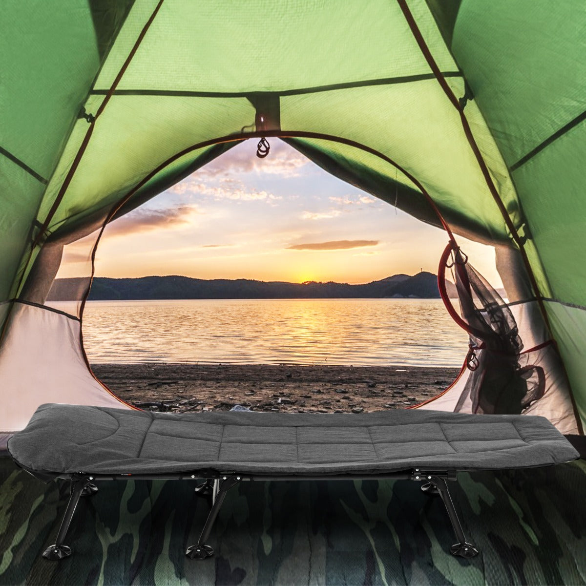This folding camping cot measures 194 x 64 x 29 cm (L x W x H) and weighs 6 kg, which is perfect for your outdoor activities. And the backrest can be adjusted in 6 positions for you to choose from. It is made of durable oxford fabric and anti-rust powder-coated steel, which is high-strength, deformation-resistant, and durable. And the fabric is breathable to keep you feeling naturally cool in hot and wet seasons. Moreover, we also provide a soft padded mattress that allows you to enjoy superior relaxation and comfort in cold seasons. the travel cot can be folded into a compact size in seconds, and then you can store it in the car trunk for easy transportation. If you are looking for a camping cot like this, do not hesitate to place an order! Sturdy and Stable Structure: The folding camping cot is constructed of thick powder-coated steel, which is not easy to rust, peel, or chip, ensuring long-lasting durability. And it features a 6-point supporting structure, ensuring great stability and a large loading capacity of 150 kg. Comfortable Lying Experience: The camping bed is designed with a removable mattress that is filled with soft sponges, providing a warm and comfortable lying experience. And there exists a padded pillow to relax your neck and head. Besides, the bottom layer is made of 600D oxford fabric, which is waterproof, wear and tear-resistant, and breathable. 6-Position Adjustable Backrest: The folding lounge chair is designed with a 6-position adjustable backrest, allowing you to read books, sunbathe, play games or enjoy deep sleep in the lie-down or reclined mode, satisfying your different needs. And the tilted mechanism is easy to adjust. Portable and Lightweight Design: The sleeping bed can be easily folded into a compact size and the folding bed only measures 61 x 16 x 84 cm(L x W x H), which would not take up much space for convenient storage and transportation. In addition, the installation is quite easy, just assemble 6 foot covers one by one. Anti-Sink Foot Covers and Wide Applications: The folding cot is equipped with 360° swivel foot covers on the bottom that help prevent the cot from sinking into the mud or loose ground while adding stability. Therefore, it is suitable for the outdoor grass, forest, beach, lake, RV, deck, patio, indoor living room, bedroom, office, or any place you want to rest.
