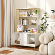 The large enclosed cabinet of the hidden cat washroom features air vents that help reduce litter tracking and eliminate unpleasant smells, ensuring a clean and fresh environment for your cat. With a convenient side entry, your furry companion can easily access their private sanctuary for some much-needed rest. Cats love to scratch, and our hidden cat washroom is equipped with a scratching pad,offering your cat with the perfect outlet for their scratching instinct, saving your furniture from unwanted damage. The hidden cat washroom with 2-tier storage shelves and a spacious tabletop provides an organized storage solution that keeps everything within arm's reach. For safety, the tall corner shelf of our hidden cat washroom is equipped with an anti-tipping device and adjustable feet pads, ensuring excellent stability and preventing any wobbling. Privacy and Ventilation Combined: The double door cat litter box enclosure prioritizes the privacy of your cats, promoting a sense of security. With a built-in ventilation system to contain smells, the decorative pet furniture ensures a fresh and clean environment. Please make sure your litter box is smaller than 57 x 50 x 40 cm(L x W x H). Abundant Storage Space: The hidden cat washroom furniture boasts 2-tier storage shelves, a spacious top, and a large cabinet, offering ample space to keep essentials neatly organized. From pet treats to storage baskets, books, and decorations, this versatile cat cabinet doubles as a functional display shelf. Removable Scratcher and Winding Entry: The tall cat litter box furniture comes with a removable scratching pad, stimulating cats to indulge in claw grinding and saving your furniture from damage. Plus, the winding entry provides easy access for cats to explore different zones, thus reducing litter tracking. Stability and Safety Features: The pet house with storage includes an anti-tipping device on the tall corner shelf, ensuring no wobbling or tipping. Additionally, adjustable foot pads and robust metal frame further enhance stability, providing a secure foundation on uneven surfaces. Decorative Pet Furniture: With the rustic wood grain and black-finished metal frame/gold-finished metal frame, the industrial cat cabinet seamlessly integrates into various interior settings. The overall dimensions of the litter box furniture with storage measures 90 x 50 x 145 cm(L x W x H).