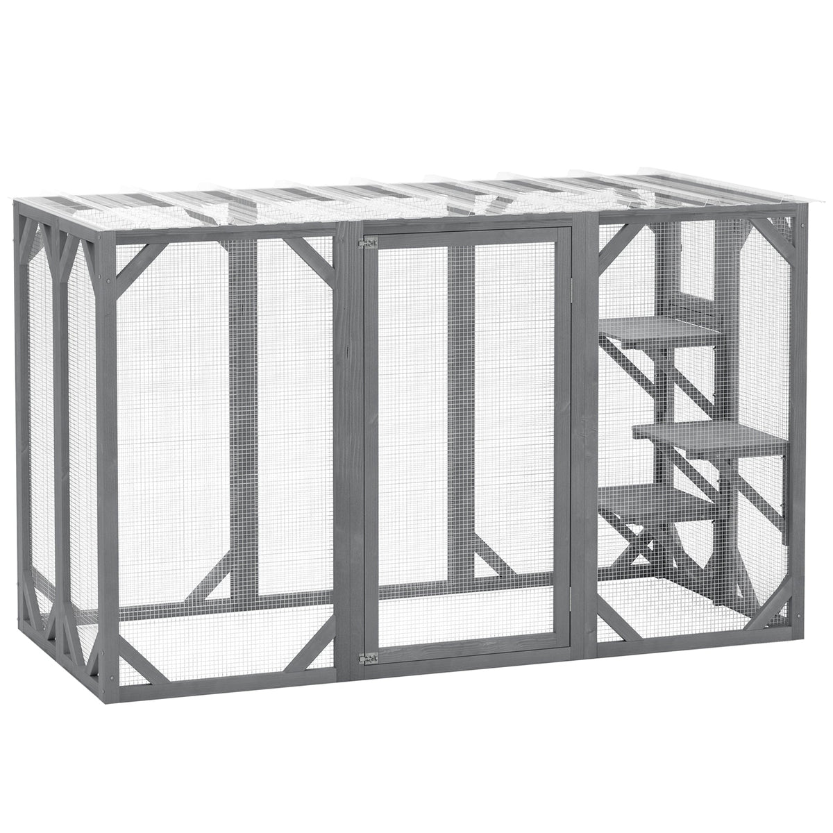 PawHut 71" Outdoor Wooden Cat House with Three Platforms, Large Door, Water-Resistant Roof, for Multiple Cats, Grey - Grey