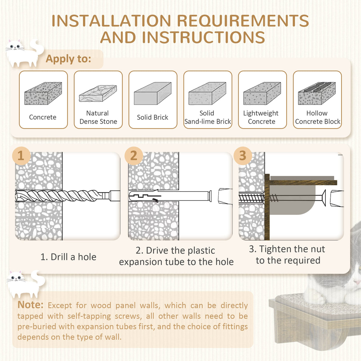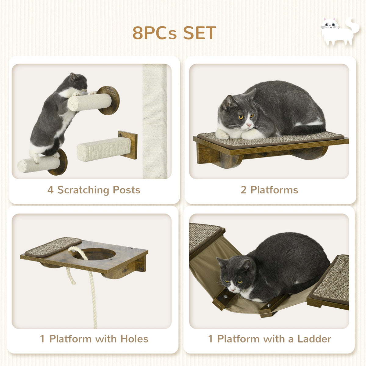 PawHut 8Pcs Wall Mounted Cat Tree with Scratching Posts, Perches, Ladder, for Sleeping, Playing, Lounging - Brown - Brown