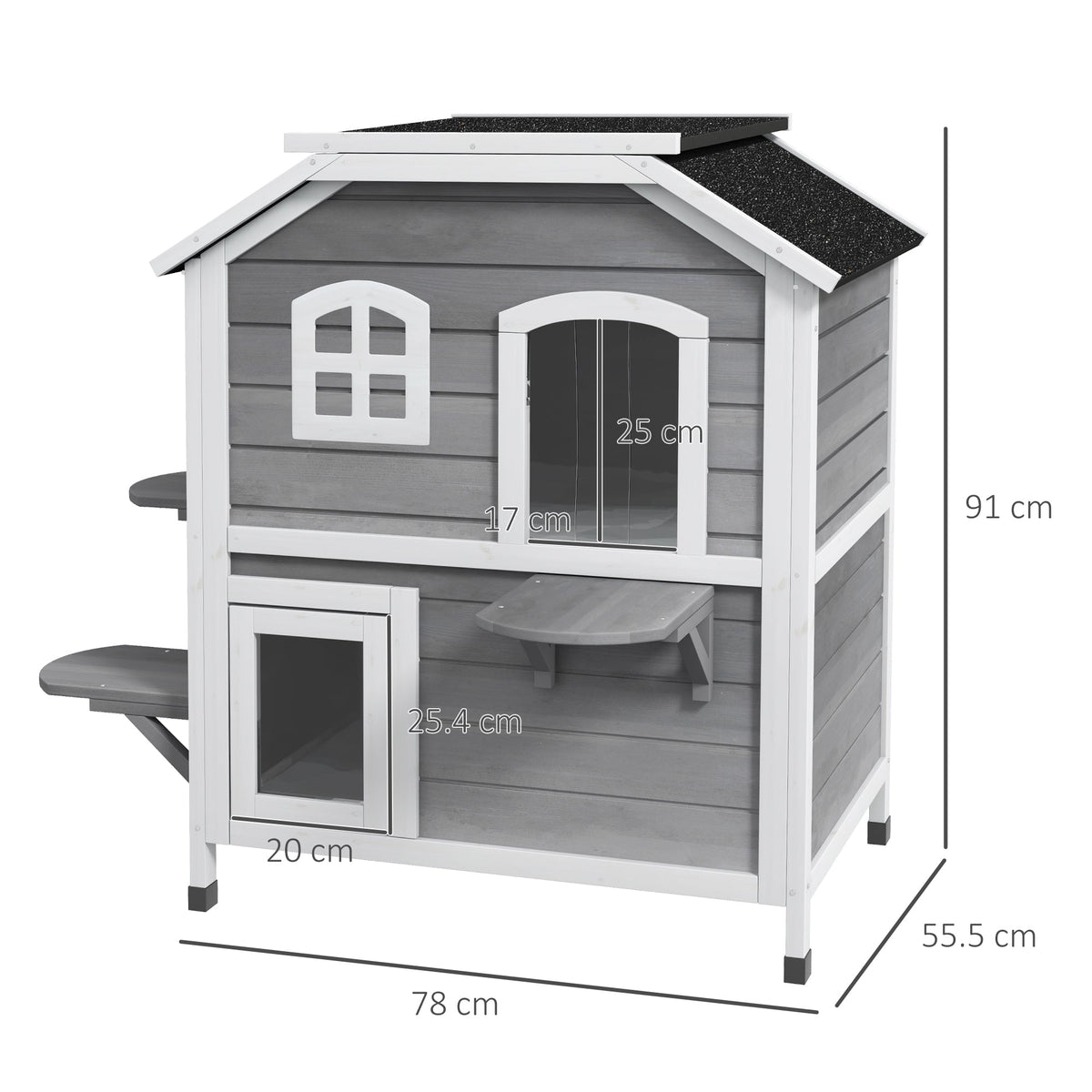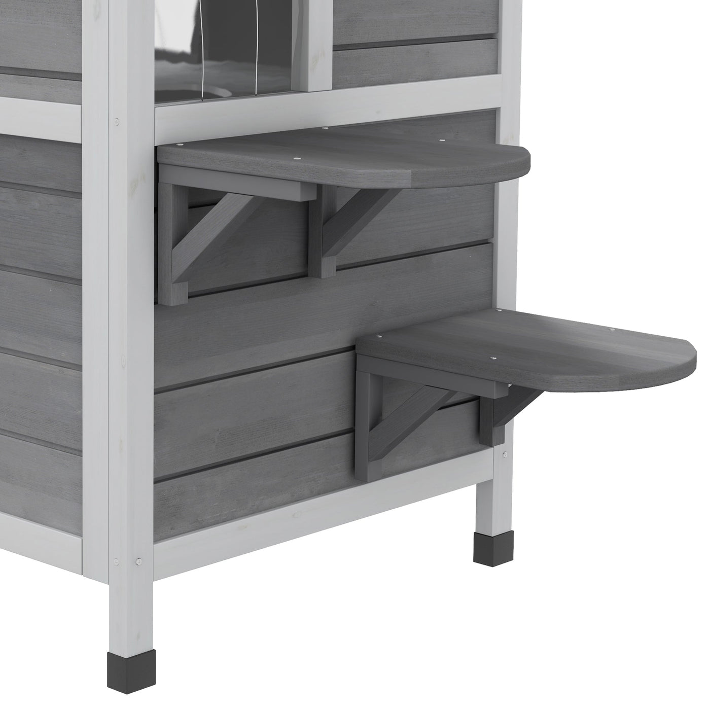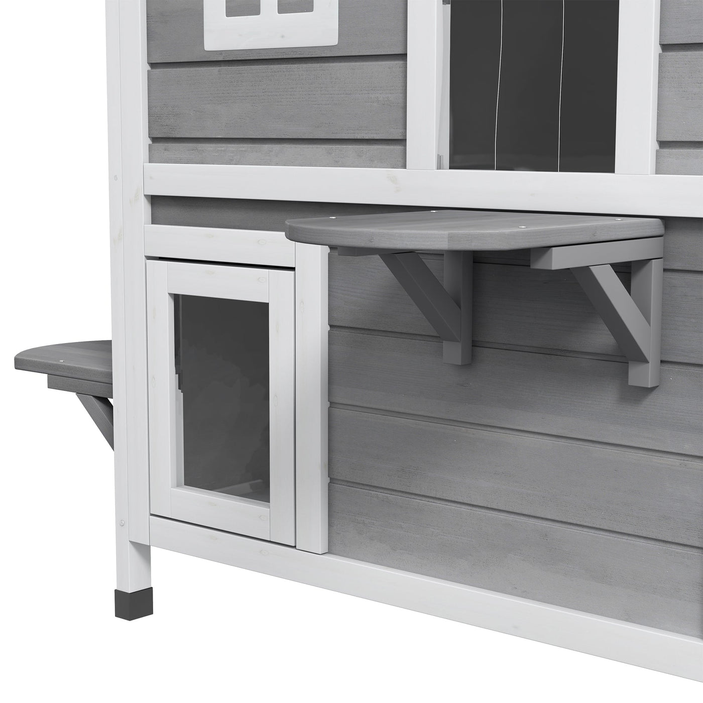 PawHut 2-story Cat House Outdoor, Weatherproof Wooden Cat Enclosure for Feral Cats with Escape Door, Openable Roof, Jumping Platforms, Grey - Grey