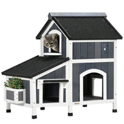 PawHut Wooden Cat House with Flower Pot, Windows, Multiple Entrances, Water-Resistant Roof for Outdoor - Grey - Grey