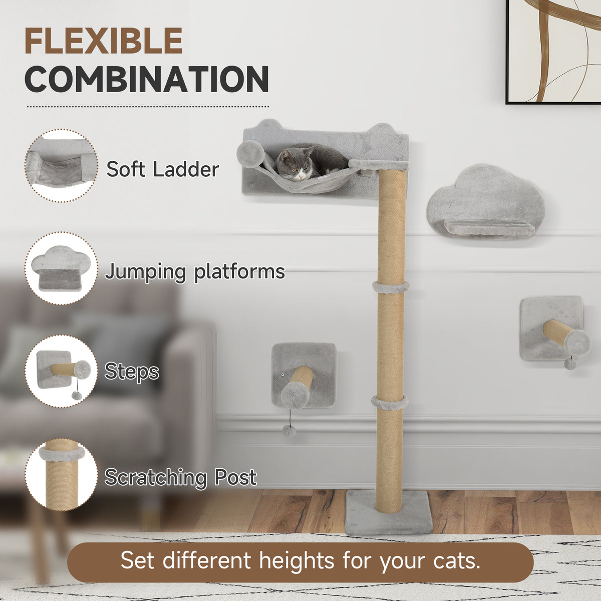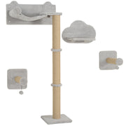 PawHut 4-Piece Cat Shelves w/ Scratching Post, Steps, Jumping Platform, Ladder, Toy Balls, for Indoor Cats, Light Grey - Light Grey