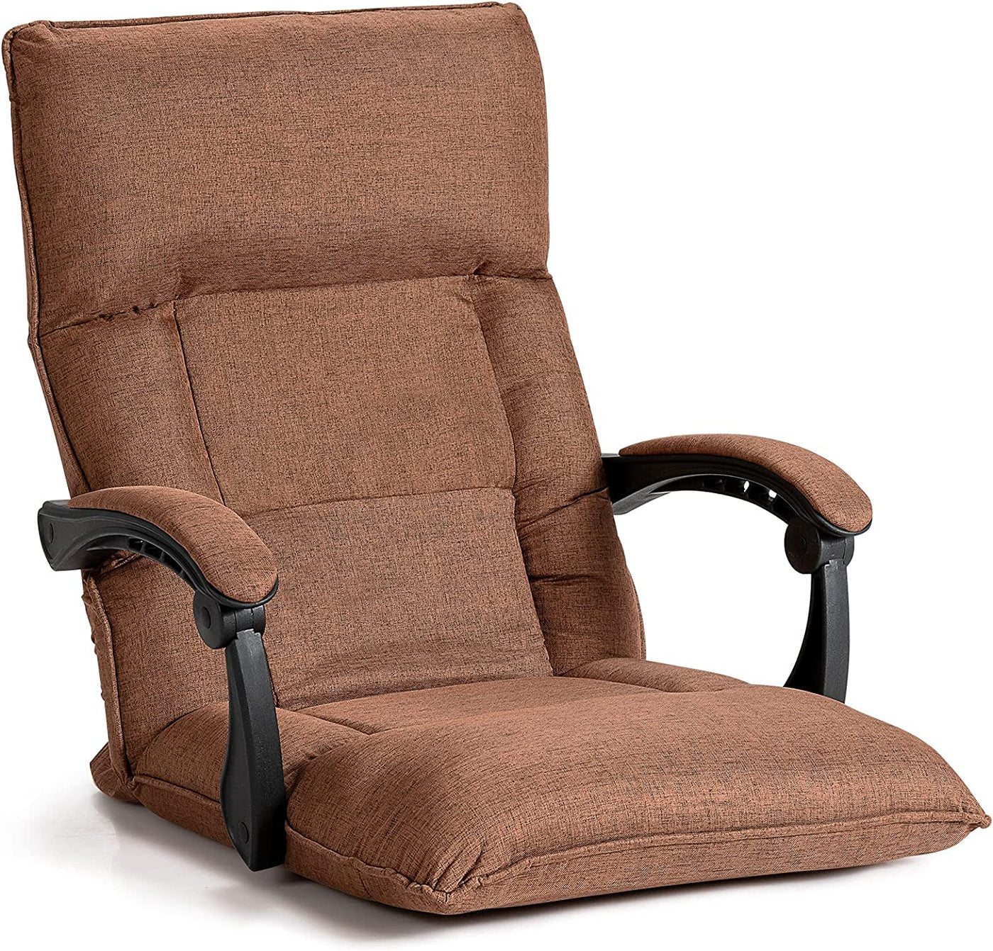Color: Coffee/Grey Material: Steel, ABS plastic, sponge, PP cotton, linen Product dimension: 67 x 74 x 75 cm (L x W x H) Flat dimension: 67 x 128 x 20 cm (L x W x H) Seat size: 58 x 46 cm (L x W) Lumber size: 31 x 19 cm (L x W) Maximum weight: 100 kg Net weight: 8.5 kg Box Qty:1(May vary by batch)Package includes: 1 x Floor sofa 1 x Instruction