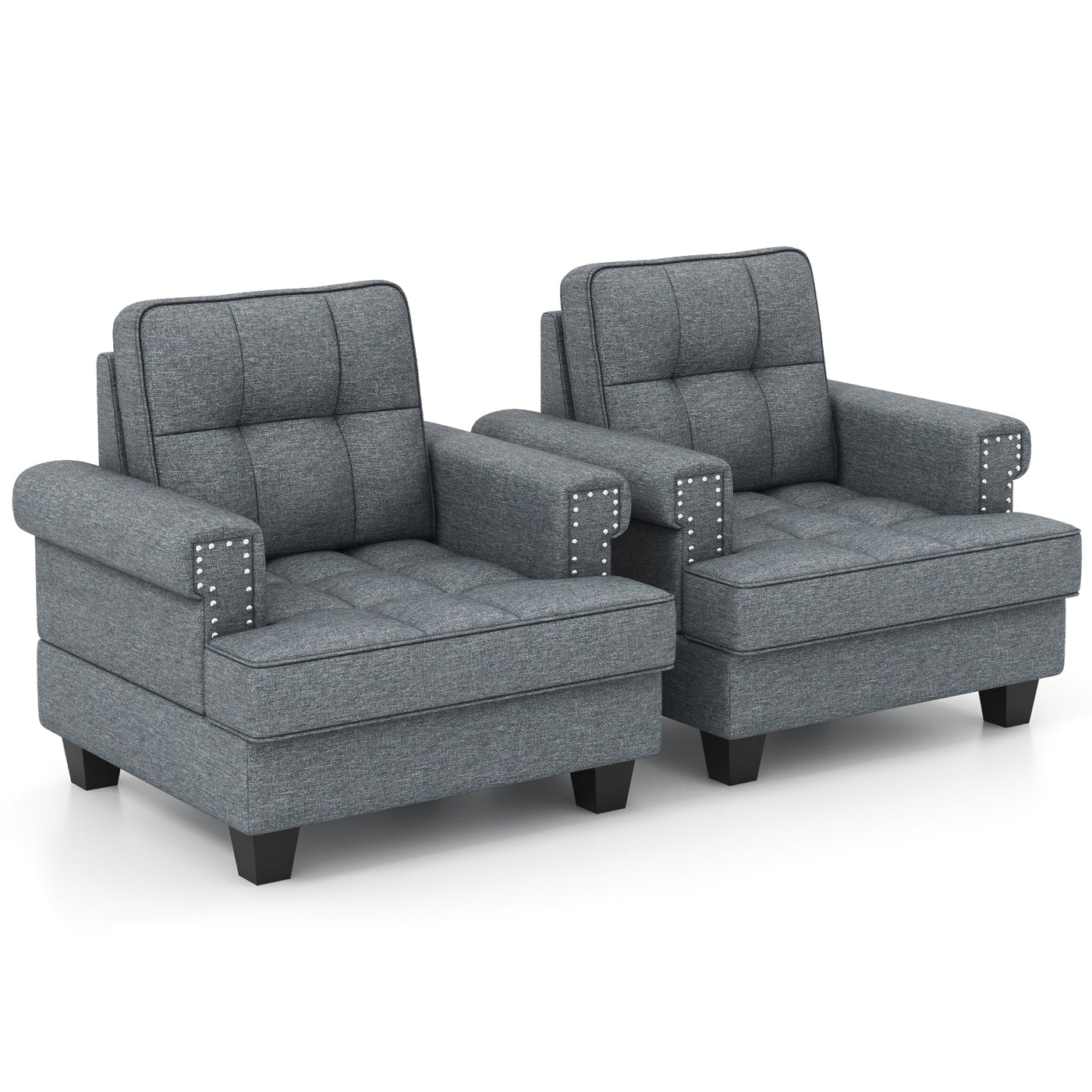Enjoy unforgettable leisure times with our mid-century modern accent chair!This upholstered armchair has a thick pillow and cushion, offering more support for your body. Attached to the chair with hook and loop fasteners, the pillow and cushion can be removed easily. Moreover, this comfy reading chair features a widened design for enhanced comfort. The high-density sponge and elastic pocket springs in the cushion ensure unparalleled relaxation. Additionally, the plastic legs with wood grain contribute to overall steadiness. The tufted and studded design make it a perfect addition to any room, such as the living room or bedroom, where you can read, relax or play games. Lastly, installation is a breeze thanks to the detailed user's manual. Thick Pillow and Unique Cushion: This upholstered armchair has been equipped with a thick pillow and extended cushion, which offer more support for your body parts. Besides, both the pillow and cushion are attached to the accent chair with hook and loop fasteners for easy removal. Upgraded Comfort and Relaxation: Varying from other chairs, this one boasts a widened sitting area for ungraded coziness. What's more, the high-density sponge provides you with ultimate relaxation. Likewise, the elastic pocket springs in the cushion make you feel more comfortable while reading, watching, gaming, relaxing, etc. Designed for Steadiness: Supported by solid rubber wood structure, the reading sofa chair boasts excellent durability and sturdiness. More importantly, the firm connections and anti-slip foot pads enhance overall stability. As a result, the modern accent chair holds up to 180 kg. Stylish Design and Wide Application: This modern upholstered armchair features elegant tufted design as well as vintage rivet decoration. Thus, it is a perfect addition to your living room, bedroom, reception room and more, imparting a timeless touch to your house. Simple to Assemble and Maintain: Coming with clear instruction and complete accessories, the studded reading chair can be assembled easily. Furthermore, the wear resistant linen cloth can be wiped with a clean rag to render daily maintenance a breeze.