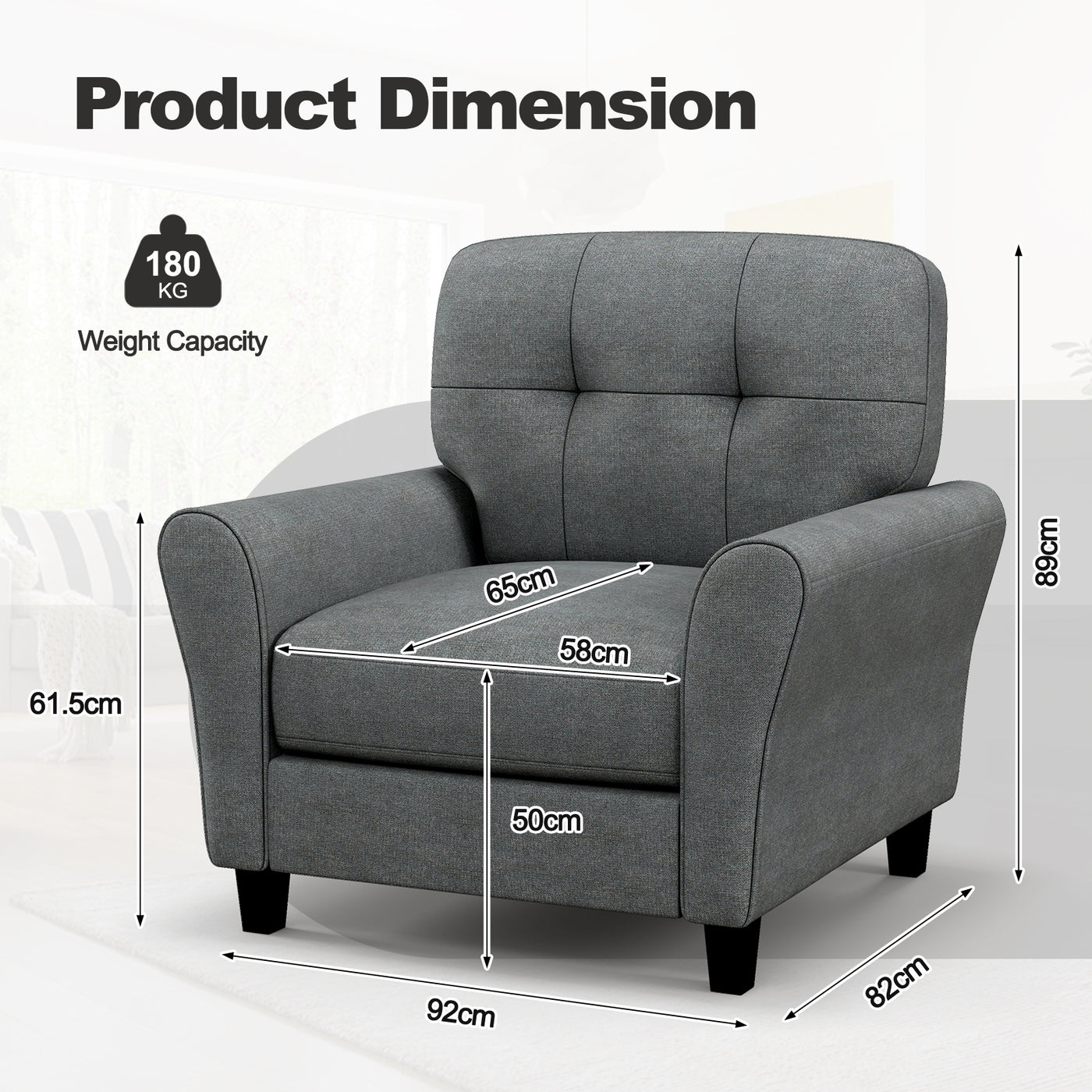 Colour: Grey Materials: Rubber Wood, Linen Fabric, Sponge, Composite Board Product Dimension: 92 x 82 x 89 cm (L x W x H) Size of Seat: 58 x 65 cm (W x D) Seat Height (with Seat Cushion): 50 cm Height from Ground to Armrest: 62 cm Net Weight: 25 kg Weight Capacity: 180 kg >Box Qty:1(May vary by batch)Package Includes: 1 x Single Sofa Chair 1 x Instruction Manual