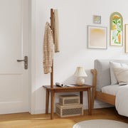 Revamp your living space with our side table with coat rack! As a good combination of a coat rack, side table and shoe bench, this hanger stand serves as an ideal addition to your house. Besides, the high quality solid wood ensures years of enjoyment. The hooks with rounded edges will protect things from scratches. While the capacious tabletop adds extra storage space for small items. With its space-saving design, the wooden coat rack can be placed in bedrooms, living rooms or study. Assembly is easy with the provided parts and detailed user's manual. Additionally, the smooth surface can be easily maintained by simply wiping it with a soft cloth. 3-in-1 Multi-use Design: This solid wood coat tree perfectly combines the functions of a coat rack, side tableand shoe bench. Moreover, the tabletop has a strong weight capacity of 150 kg. Solid Wood Construction: Crafted from natural rubber wood and acacia wood, the coat rack with side table is durable and sturdy. In addition, the reinforced connections enhance overall steadiness. Perfect Storage Solution: There are burr-free hooks that offer a perfect storage solution for your coat, hat, scarf and bag. More importantly, the spacious tabletop brings additional storage space for books, coffee and more items. Wide Range of Applications: With a vertical design to save floor space, this freestanding hanger stand fits well in any small place. Whether to put it in the entryway, living room, bedroom, study or more, you have the final say! Easy Assembly and Maintenance: The coat rack stand will come with all necessary parts. By referring to the detailed and illustrated user’s manual, you can assemble it easily. Furthermore, the smooth surface can be wiped with a soft rag for simple maintenance.