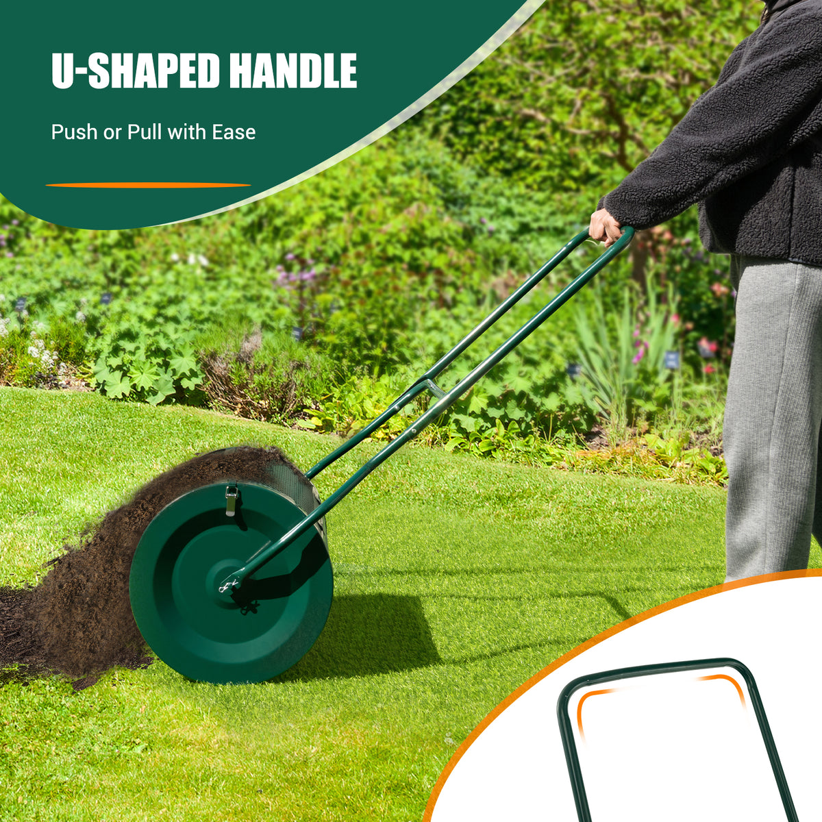 Maintain your lawn forever fertile with the 27" multifunctional garden spreader! Are you still fertilize manually by traditional methods? Are you suffering from uneven spreading of fertilizer? After purchasing of this composter spreader, these worries will disappear. 27" long metal mesh roller with intensive metal mesh will spread the top soil evenly on the lawn. In addition, the large filling door and large capacity allow you to fill as much fertilizer, manure, and peat moss as possible at one time, reducing the number of times you have to spread. In addition, the side latches are designed on both sides, which can effectively avoid damage when rolling. What's more, the extended U-shaped handle allows you to spread evenly without bending down. Additionally, you can hang the spreader on the wall for convenient storage. The all-metal spreader is sturdy and durable, with a green finish that makes it rust-proof and attractive. Efficient and Even Spread: Featuring a roller with intensive mesh, the composter spreader will break up large chunks and promote even spreading. Besides, unlike other spreaders that have the latch in the middle, we adopt a double-sided locking clasp to avoid damage and leakage during rolling. Upgrade U-shaped Handle: Equipped with a humanized U-shaped handle, you could smoothly push or pull the peat moss spreader on your lawn. The handle will release you from bending down to fertilise. Besides, the handle allows you to hang the composter spreader on the wall for storage. Create Fertile Lawn and Garden: The peat moss spreader comes with a large filling door, making it easy for you to add any fertilizer you like to feed your plants. Moreover, it has 2.7 Cb. Ft large capacity, allowing you to fill it with peat moss, compost, sand, and topsoil in large quantities. Heavy Duty Metal Frame: Constructed of a heavy metal frame, the composter garden spreader is deformation-resistant, durable and sturdy. Besides, it is sprayed with a green finish, making it stylish and not easy to rust. Simple Installation: With detailed instructions, the assembly of the compost spreader is a breeze for you. After receiving the package, you just need to prepare all the necessaries, assemble the u-shaped rod and finally install the handle to finish the assembly.
