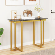 The faux marble surface boasts a luxurious and upscale look. Besides, the modern geometric metal frame not only adds a touch of sophistication but also provides sturdy support. This sofa table offers a generous surface for displaying decorative items or organizing daily essentials. Its stylish design complements a variety of decor themes from contemporary to classic. Make a statement with this contemporary and eye-catching piece! Bullet Point:Luxurious Design: The blend of white faux marble top and geometric black/gold frame brings a luxurious aesthetic to your space. This console table strikes the perfect balance between functionality and style, making it a stunning addition to your furniture collection. Built with Strength: Crafted from powder-coated metal frame, the entryway table supports up to 90 kg, ensuring stability and longevity. Besides, the bottom legs are equipped with non-slip foot pads for floor protection. Abundant Storage and Display Space: With a tabletop size of 107 x 40 cm, the sofa accent table is spacious to store and display books, plants, photos, handicrafts and decorative items. Any daily essentials placed on it can be accessible easily. Versatile Usage: This hallway table can be placed against the wall or behind a sofa. You can use it to create a focal point in your entryway or add a decorative piece to your living room, boosting both style and utility. Thoughtful Details and Size: The round table corners are designed to prevent scratches. Also, its smooth surface brings much convenience in daily clean-up. Overall Dimensions: 107 x 40 x 80 cm (L x W x H).