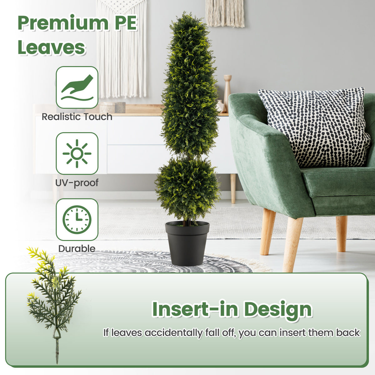 Experience the beauty of nature with this stunning artificial topiary tree. With its high-simulated design, the leaves showcase a mesmerizing gradient of colthiss that stay lush and vibrant throughout the year. Natural vines and vivid nylon moss add an extra touch of elegance, ensuring long-lasting beauty that resists the test of time. Crafted using premium materials, this topiary tree offers exceptional UV resistance, allowing it to maintain its vibrant colthiss even when placed outdoors. Its hidden metal tubes and cement-filled base provide stability, making it wobble-free and resistant to accidental collisions from kids or pets. Enjoy the convenience of low maintenance as this artificial tree needs no fertilization, watering or trimming. Simply unpack and fluff the leaves by hand. It needs no assembly. If any leaves fall off, its insert-in design allows you to easily insert them back in place. High-Simulated Beauty: Add a touch of nature to your space. Its leaves with gradient colors stay lush and vibrant all year round. Also, the artificial tree contains natural vines and vivid nylon moss to offer long-lasting beauty that stands the test of time. UV-Proof Decoration: Crafted of premium materials, the topiary tree presents great UV resistance to maintain vibrant colors even outdoors. As needed, it could fill both indoor and outdoor space with equal grace and charm. Wobble-Free Addition: The faux topiary tree is cleverly designed with hidden metal tubes that show high strength to keep the faux plant stand upright. Also, it features a cement-filled base, which is weighted to resist accidental hit by kids or pets. Low Maintenance: Compared to real plants, the artificial version needs no watering, trimming or fertilization. As a result, you can save a lot of maintenance time and spend more time appreciating the topiary tree. Needs No Assembly: To maximizing the convenience, the faux boxwood tree requires no installation. All you have to do is unpack the tree and fluff its leaves manually. By the way, the topiary plant features an insert-in design, allowing you to insert leaves back in place when they accidentally fall off.