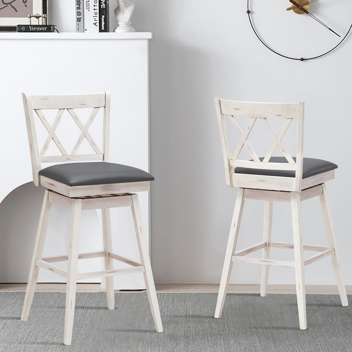 Transform your house or business place with the simple elegance and contemporary bar stool. Constructed of a solid rubber wood frame, these bar stools are strong enough to support 264 pound without wobbling. And the PVC leather cushion is filled with soft sponge to offer you comfortable and cozy seating. What's more, it can rotate 360°to bring a wider range of motion. With the waterproof PVC surface, the seat is easy to clean and care. In addition, this stool has simple structure, allowing you to install it with a few minutes. The delicate finish and sophisticated appearance makes this barstool ideal for various occasions, including living room, office, coffee shop, pub and more. 360° Swivel Seat for Convenience: Equipped with a swivel seat, the bar chair allows you and your guests to switch directions freely, which make conversation easier. The premium footrest is able to help you rest your legs and find the most comfortable sitting position. Soft Cushion and Ergonomic Backrest: The high density sponge padded with breathable leather cover will not only keep you away from the stuffiness, but also provide you with maximum comfort. Additionally, the ergonomic backrest gives your back additional support. Durable and Sturdy Construction: The bar stool is made of high quality rubber wood with a contoured X-back frame, making it superior in stability and durability. And it can hold up to264 lbs. Also, the solid leg keeps it stable without shaking. Suitable for Various Occasions: With simple lines and rustic chic appearance, this 2pcs bar stools add a stylish and sophisticated look to any room. It can be perfectly matched with various decorative styles, and you can put in your kitchen, living room, bar, patio or restaurant. Easy to Install and Clean: There are required parts and detailed instructions in the package. You only need to spend a little time to put it together. Besides, the upholstered seats are covered in easy-care PVC surface, so you can clean it effortlessly by a damp cloth.