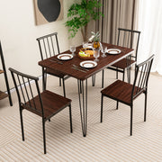 This dining table set is perfect for small spaces, offering enough room for up to 4 people. When not in use, you can neatly place chairs underneath the table to save precious floor space. Made of selected materials, it features sturdy sprayed metal frames that resist rust. And the dining table has triangle legs with protective foot pads that can handle a weight of up to 91 kg. The kitchen table set utilizes thickened MDF boards, ensuring they won’t deform or crack, and their smooth finish requires minimal maintenance. The natural wood grains add a timeless touch to its design. The dining chairs are built for comfort, with an extra crossbar for added stability and the ability to support up to 150 kg. They also boast an ergonomically designed backrest and a wide seat for an enjoyable dining experience. With an easy setup process using the provided manual and accessories, you can easily incorporate this versatile dining table set into your kitchen, dining room, or even a restaurant. Ideal for Small Space: The dining table and 4 reliable dining chairs are moderately sized to adapt to smaller spaces, while still accommodating up to 4 people. Besides, when not in use, you can throw chairs under the table to free up more floor space. Reliable Metal Frame: Built with sprayed metal, the kitchen table set offers optimal rust resistance to serve for a longer time. Especially its dining table features triangle legs with protective foot pads, which can withstand a weight up to 200 lbs. Strong and Rustic Boards: The stable dining table set boasts thickened MDF boards, which ideally resist deformations or cracks, while having a burr-free feature for low maintenance. Also, its natural wood grains make it a timeless addition for your home. Comfortable Seating: With an extra crossbar, each dining chair can support up to 330 lbs. Moreover, it is ergonomically designed with a properly inclined backrest and a wide seat, creating a comfy resting spot for your dining experience. Easy Setup and Wide Use: The table set of 5 is equipped with a detailed manual and all needed accessories, simplifying the entire installation. As required, you can add it into your kitchen, dining room, restaurant, etc.