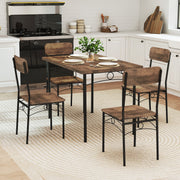 Our industrial 5-piece dining table set includes a table and 4 chairs, which is perfect for intimate family dinners or entertaining guests. Built with a robust metal frame, complemented with sturdy MDF wood boards, the table and chairs ensure both strength and stability, providing a reliable dining experience. Also, the veneered MDF tabletop is waterproof, ensuring a hassle-free maintenance. When not in use, 4 chairs can be neatly stored under the table, suitable for small rooms or apartments. Furthermore, the stylish combination of vintage brown wooden boards and metal accents adds a touch of retro charm to your home decoration, making it a timeless addition to your living space. If you are looking for such a product, do not hesitate to buy it! Complete 5-Piece Set: This dining set includes a rectangular table measuring 110 x 70 x 75 cm (L x W x H) and 4 chairs measuring 39 x 43 x 86 cm (L x W x H). It is ideal for cozy family dinners or gatherings with friends. Sturdy and Reliable Construction: The dinette set adopts a robust metal frame, ensuring a strong loading capacity and long-lasting durability. The table loads up to 90 kg, and each chair loads up to 150 kg. Additionally, there are non-slip footpads on the bottom for enhanced stability. Space-Saving Design & Comfy Seating: 4 chairs can be tucked under the table when not in use, making the dining set perfect for small places. Additionally, the chairs are designed with high and curved backrests, providing better lumbar support. Versatile Application: The fusion of retro brown wood finishes and metal accents exudes a timeless charm, infusing your dining space with a sophisticated and inviting allure. Whether hosting a formal dinner, casual brunch, or cozy game night, this versatile dining set can be a perfect choice. Easy Maintenance & Assembly: The dining table boasts a premium MDF tabletop with veneers, which is waterproof and scratch-resistant, making maintenance a breeze. Besides, with its simple structure and clear illustrations in the user's manual, this dining set is easy to set up.