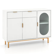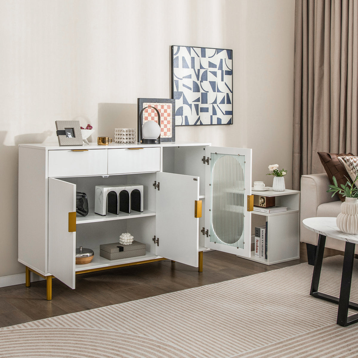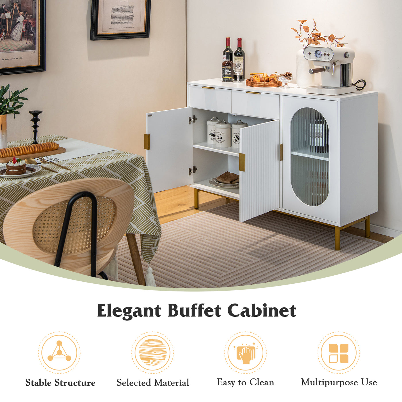 Say goodbye to clutter and hello to a beautifully organized space with our Large Kitchen Storage Cabinet. This cabinet is designed to provide you with ample storage options, allowing you to keep your kitchen, bedroom, or living room organized and within easy reach. Its sleek and modern design seamlessly blends into any space, while its thoughtfully crafted details ensure durability and functionality. Large Storage Space: This kitchen storage cabinet offers an abundance of storage options with 2 spacious drawers and 2 big cabinets with doors. Additionally, the top of the cabinet provides a perfect spot to showcase decorative items like potted plants and photo frames, adding a touch of style to your space. Durable and Safe Use: Crafted with high-quality MDF board and a painted surface, this buffet server sideboard guarantees durability and stability for long-term use. The cabinet is designed with an anti-toppling device that securely attaches it to the wall, ensuring it stays in place and eliminating the risk of tipping over or wobbling. Wide Application: With its modern and elegant appearance, this kitchen storage organizer seamlessly blends into any space. Whether it's the kitchen, bedroom, or living room, this versatile cabinet keeps your belongings organized and within easy reach. More Thoughtful Details: Elevate your space with the addition of solid metal legs, reinforced hinges, and a sleek translucent door. These thoughtful details not only enhance the cabinet's overall appearance but also ensure enhanced durability and functionality. Easy assembly and Maintain: thanks to the simple instructions and provided hardware, setting up this storage cabinet is a breeze. Additionally, the smooth surfaces of this cabinet make maintenance quick and effortless. Just wipe it with a wet cloth to keep it clean and looking pristine.