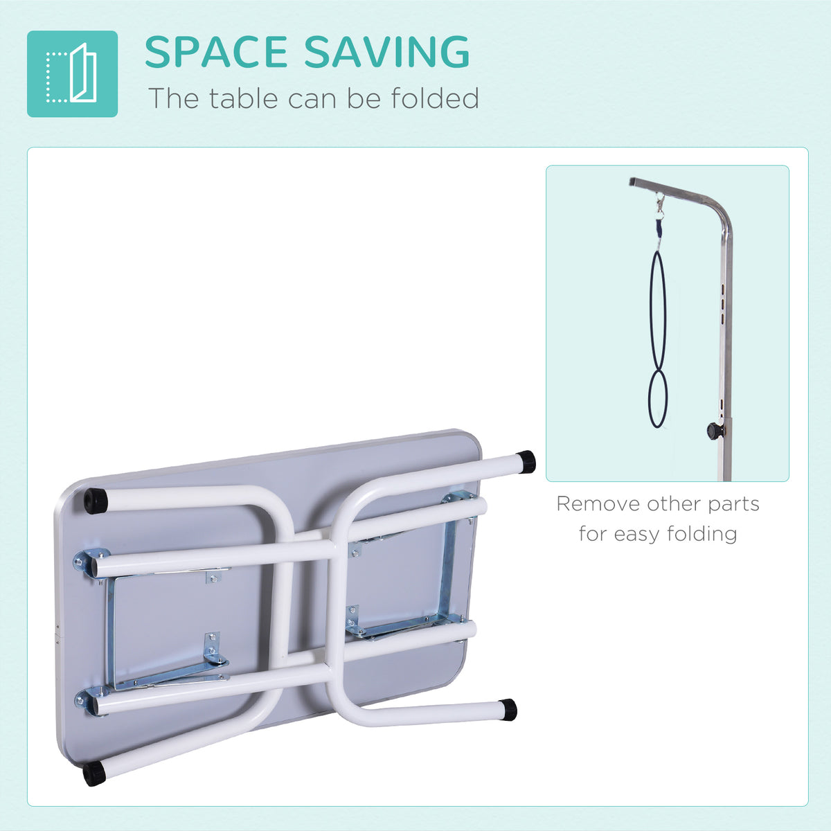 Enhance your pet's appearance with the PawHut dog grooming table. Suitable for various dog sizes, it features an adjustable arm, non-slip surface and secure leash for safe grooming. This foldable table offers easy storage and portability, ensuring your pet looks and feels great with minimal effort.