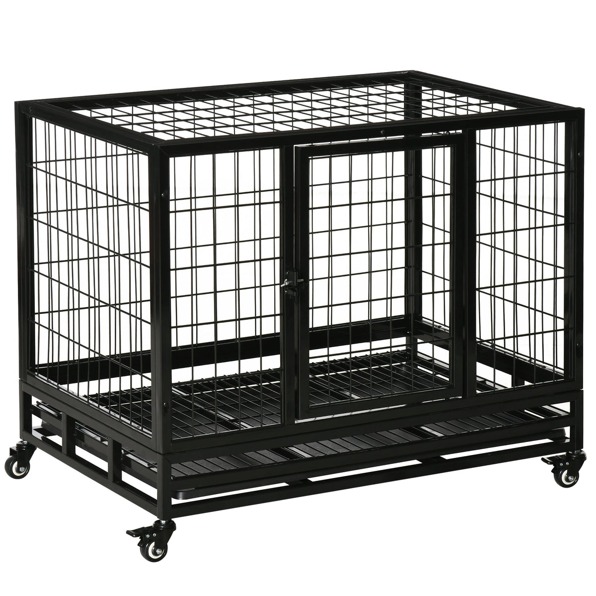 PawHut 36" Heavy Duty Metal Dog Crate Pet Cage with Tray Wheeled Dog Kennel - Black (Medium) - Black