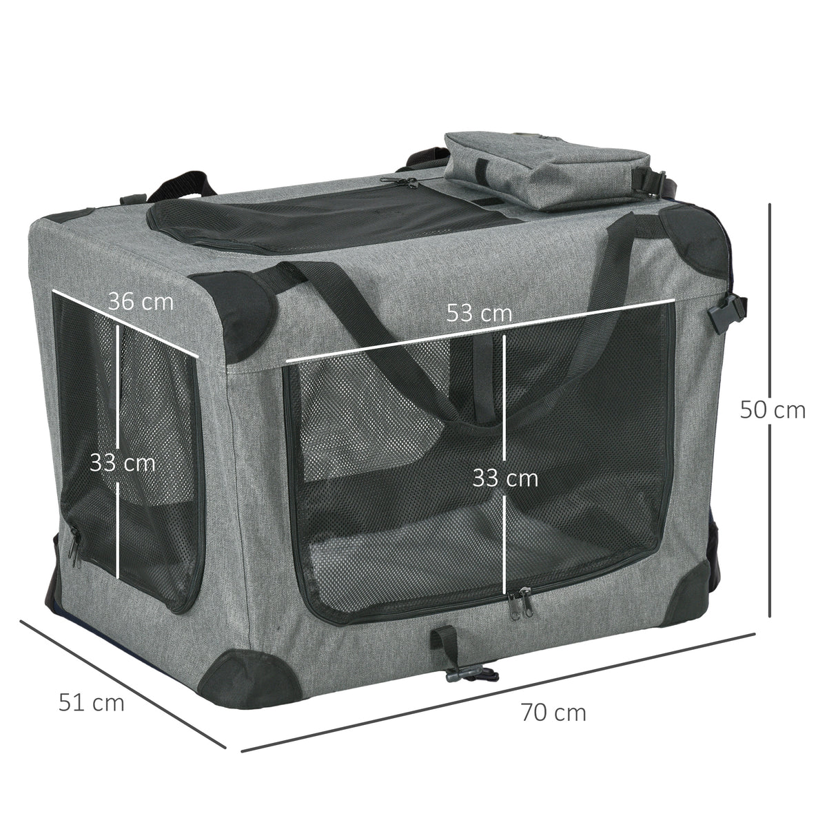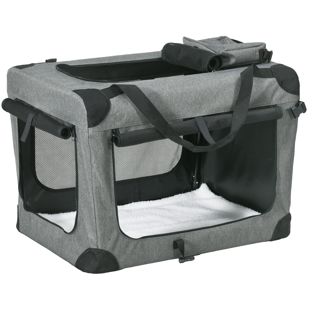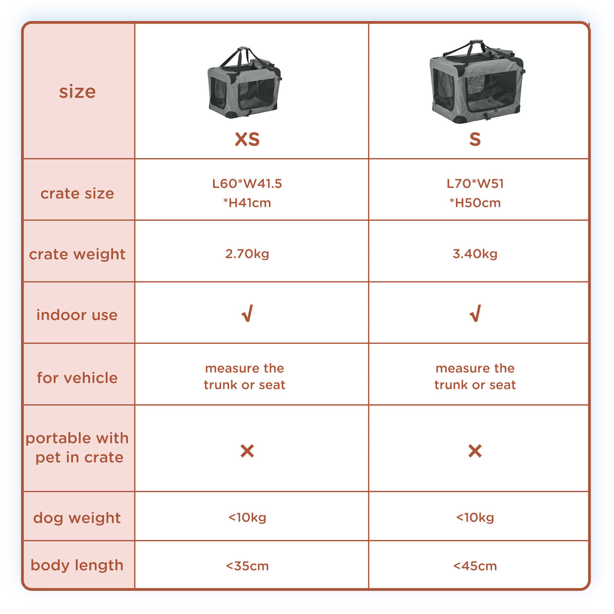 This PawHut fabric dog crate for small dogs and cats creates a roomy space for your furry friends. Keep your pet cool and comfortable with mesh doors and windows that provide air circulation and a good view. The cat travel carrier includes 2 storage bags on the top and back for storing pet supplies. The foldable design of this dog carrier makes transportation and storage a breeze.