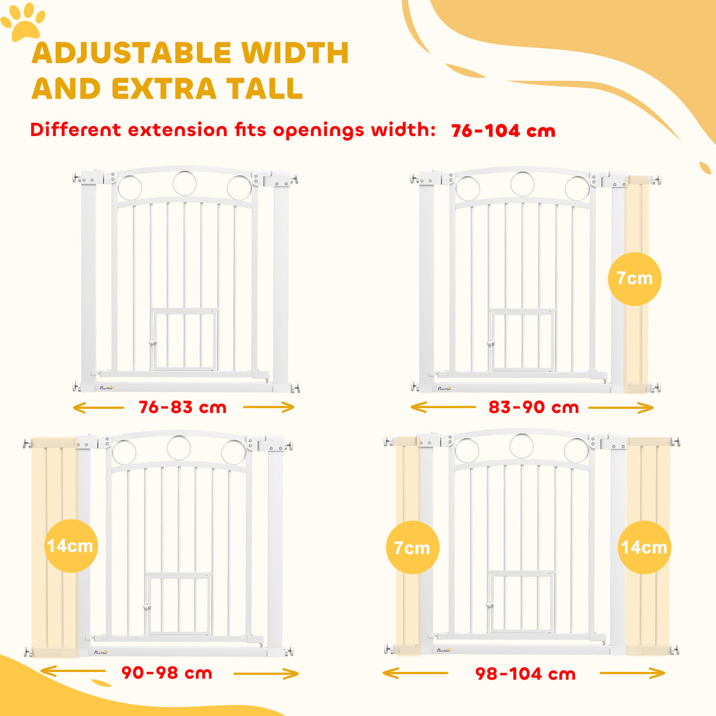 PawHut 77cm Tall Dog Gate with Cat Door, 7cm and 14cm Extensions, for Stairs, Doorways, 76-104cm Width - White