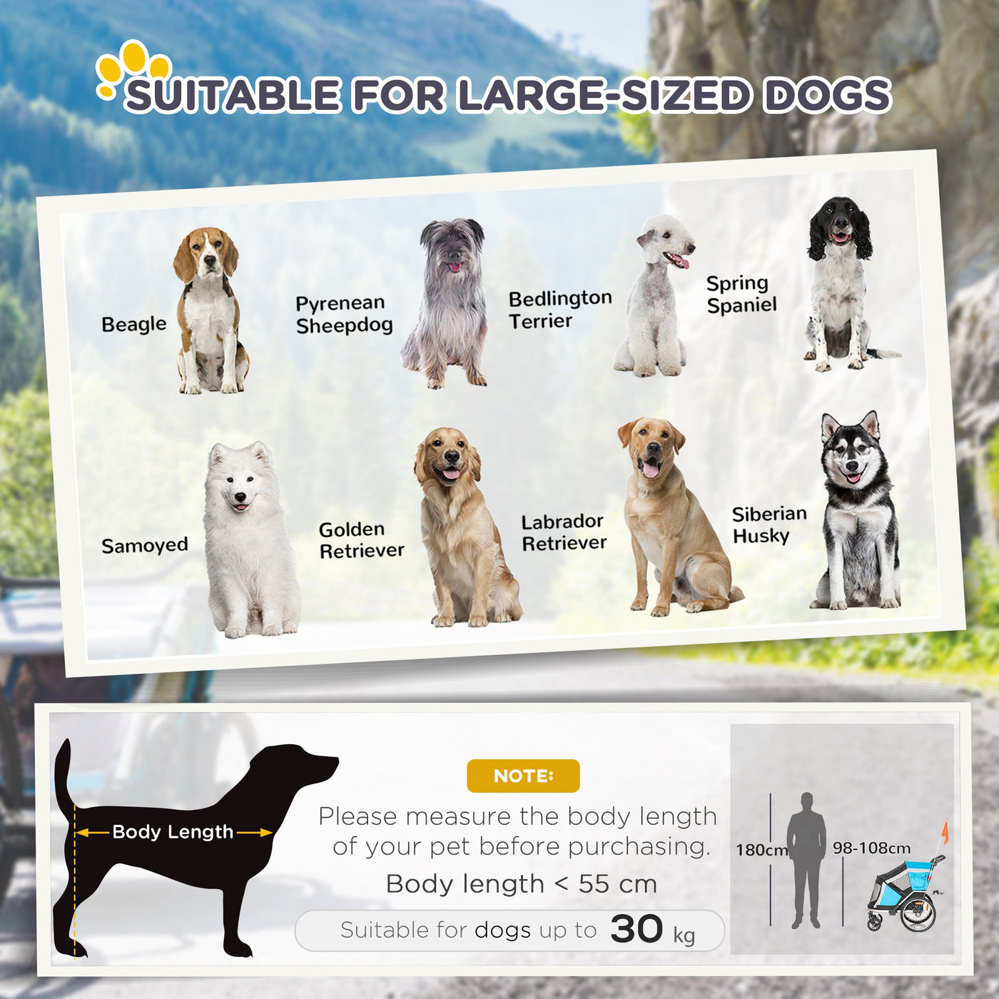 Enjoy adventures with your pets, thanks to this bike trailer for dogs from PawHut. It can be pushed as a stroller or attached to a bike, which is ideal for longer journeys. Three zippered doors let your pet get on and off, whilst the meshed windows and sunroof keep your pet cool on their trip. With added reflectors and a reg flag at the back of the dog carts with wheels, you'll stay visible in traffic and at night. Strap your pet to the leash and treat them to a fun day out.