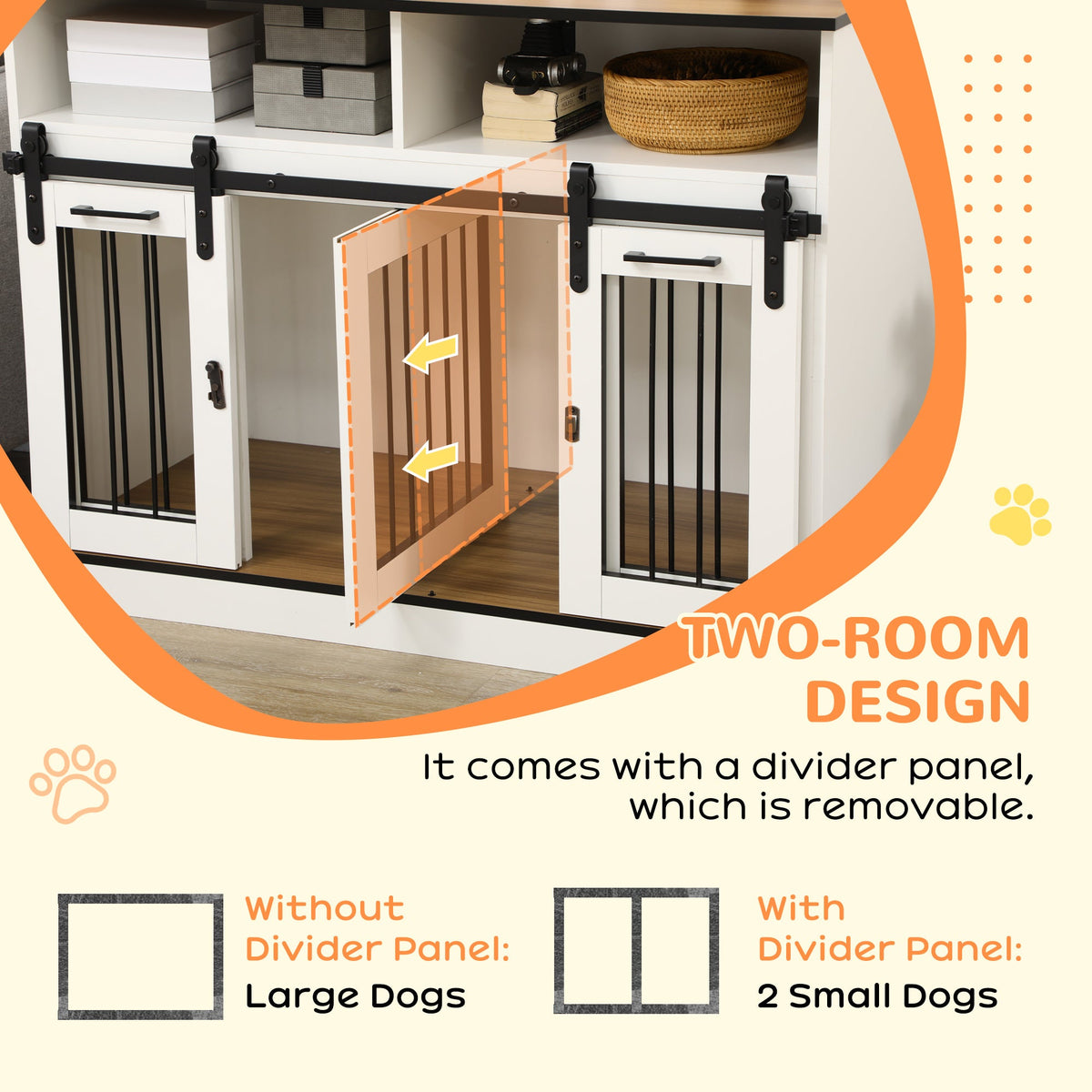 Need pets in one place? This PawHut dog cage is your solution. A sleek and modern appearance, it has a divider, so two small dogs have space to relax, or you can remove the divider, making it suitable for one large dog. Easily store supplies and more, thanks to the open shelves. Use the wide tabletop to display your favourite pieces, adding style and decoration. A secure space for pets to relax comfortably - and you can enjoy a stylish side table that boosts home décor.