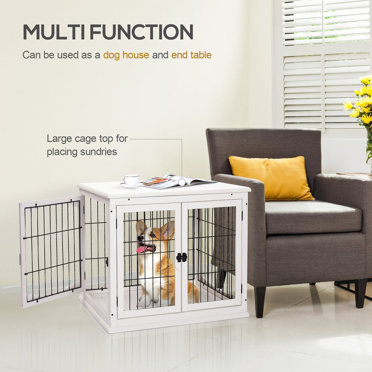 PawHut Dog Crate Furniture, Puppy Crate End Table, Pet Kennel House with 2 Doors for Medium and Small Dogs, 81 x 58.5 x 66 cm, White - White